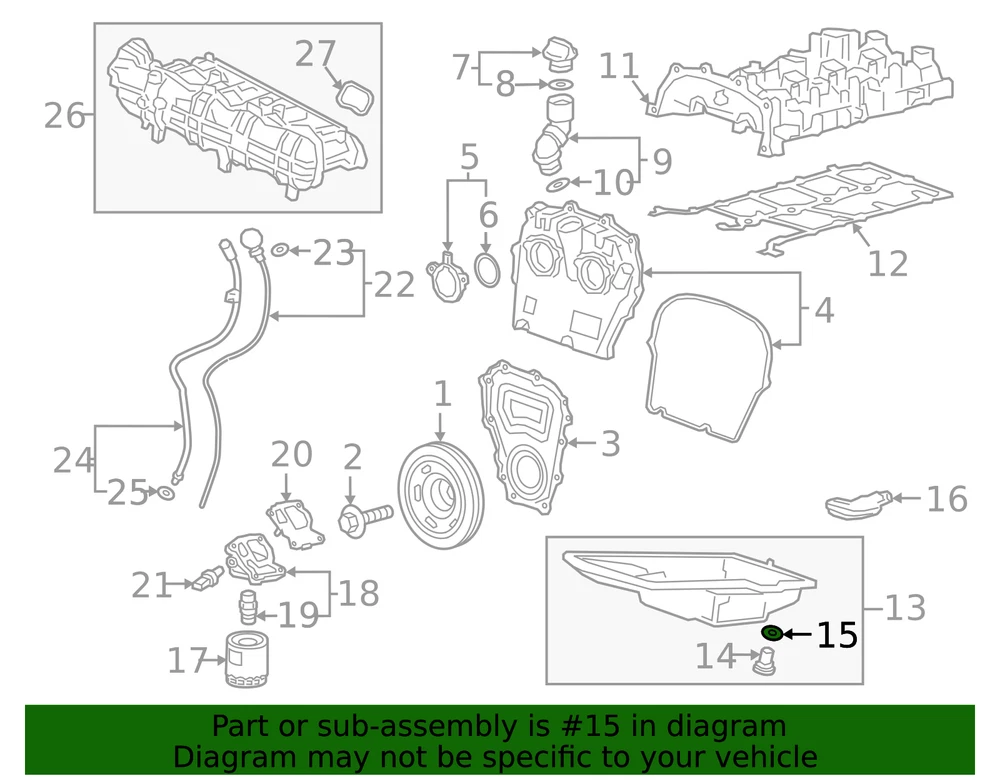 aaronchevrolet Genuine GM Oil Pan Drain Plug Seal 12667457 Part can be found as # 15 in the diagram above Product Description 2.7L turbo. 1.3L turbo. 2.0L. Helps prevent leaks in various components of your vehicle This GM Genuine Part is designed, engineered, and tested to rigorous standards and is backed by General Motors Original equipment parts are designed to work with your GM vehicle safety systems -- aftermarket replacement parts may not meet the same OE safety regulations, depending on the part type Specifications Brand GM Manufacturer Part Number 12667457 SKU 12667457 Product Genuine GM Oil Pan Drain Plug Seal 12667457 ONLY PART REFERENCE #15 ON THE DIAGRAM IS INCLUDED WARNING : May cause cancer and reproductive harm. See www.P65Warnings.ca.gov for more info. Terms and Conditions Thank you for shopping with us. Please find our policies below. If you have any other questions, please don't hesitate to contact us. Shipping Terms If you are located in Alaska, Hawaii or Puerto Rico Please contact us via eBay email to discuss shipping cost In stock orders ship within 24 hours. Weekend orders will be processed the next business day. If a part is not in stock and must be ordered from the manufacturer, it usually takes 2-3 days to arrive to us and will be promptly shipped to you. Most of the orders are shipped complete within 2-3 business days. A few of the parts ordered from the manufacturer may take up to 5-6 business days to arrive and will shipped to you immediately. Depending upon location, ground shipments usually take 2-7 days. Your order may be shipped Overnight for an additional cost. Oversized shipments will be additional; you will be contacted prior to shipping for approval. We cannot guarantee transit times for ground and oversize orders. Shipping Carrier substitutions may be made at our determination in an attempt to reduce shipping cost to the customer. We do not ship internationally. In the unlikely event that a part has been placed on backorder or discontinued, we will do our best to try and find one for you as quickly as possible. We do not ship COD orders. Return Policy Contact us to arrange for any returns. A copy of the invoice will need to be included with the return. Parts must be resaleable and in the original packaging. We cannot take back used parts. We cannot take back installed or tried parts. Electrical parts are not returnable. We do reserve the right to refuse and return any parts we find have been installed, are used or do not meet the above criteria. Return request need to be within 30 days of receipt. Cancellation Policy An order or a portion of an order may be cancelled up until the time it is shipped and no longer in our possession. Home • Newsletter Signup • Contact Us Copyright © 2025 aaronchevrolet , All rights reserved. Solution by RevolutionParts, Inc. :: Design by OCDesignsOnline