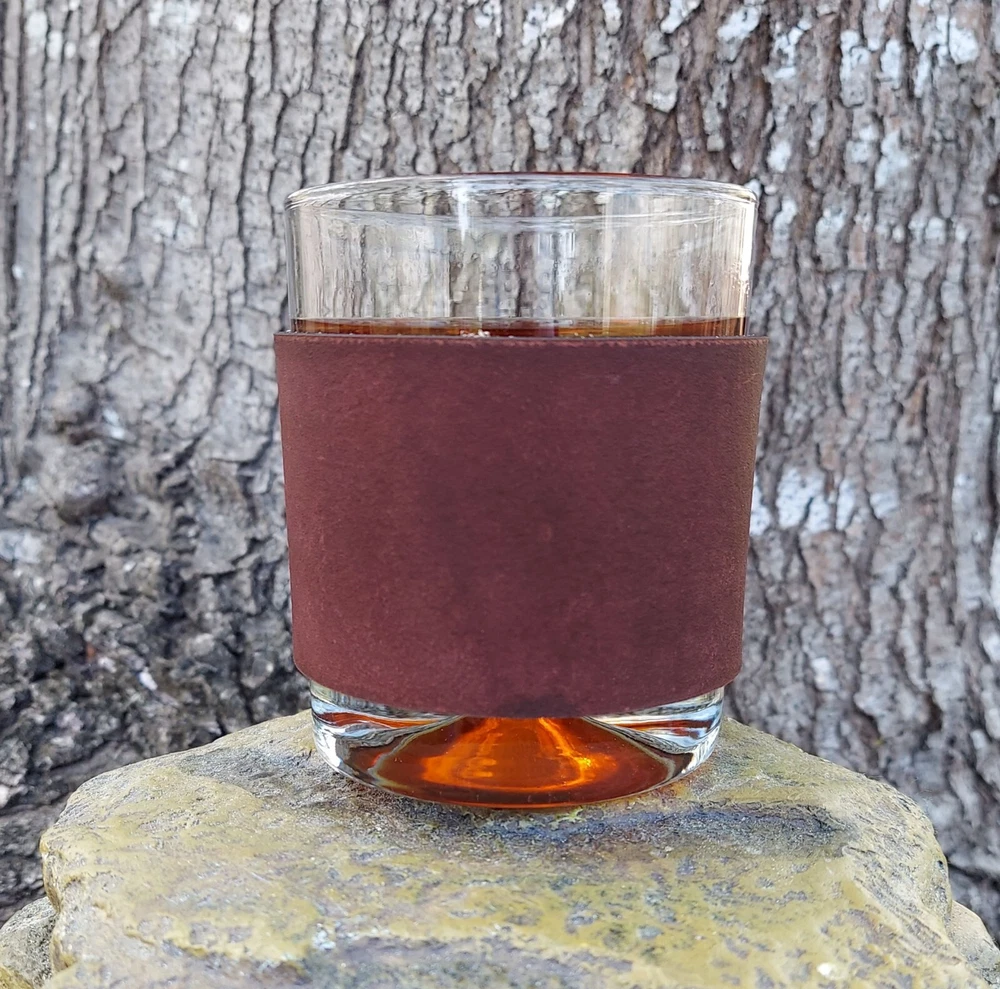 Custom Leather glass sleeve handcrafted with top grain leather. Available in natural, bridle, light and dark brown, mahogany or black. Hand stitched to firmly fit with a comfortable feel. Slides on and off for convenient washing. Personalize your sleeve with a monogram. Choose your borders. Order a single glass with sleeve or get a pair. Beautifully wrapped. Don't want a monogram? No problem, message me for more information.