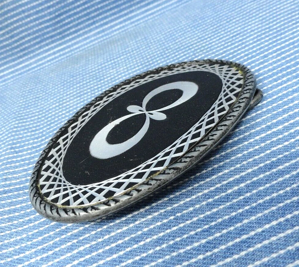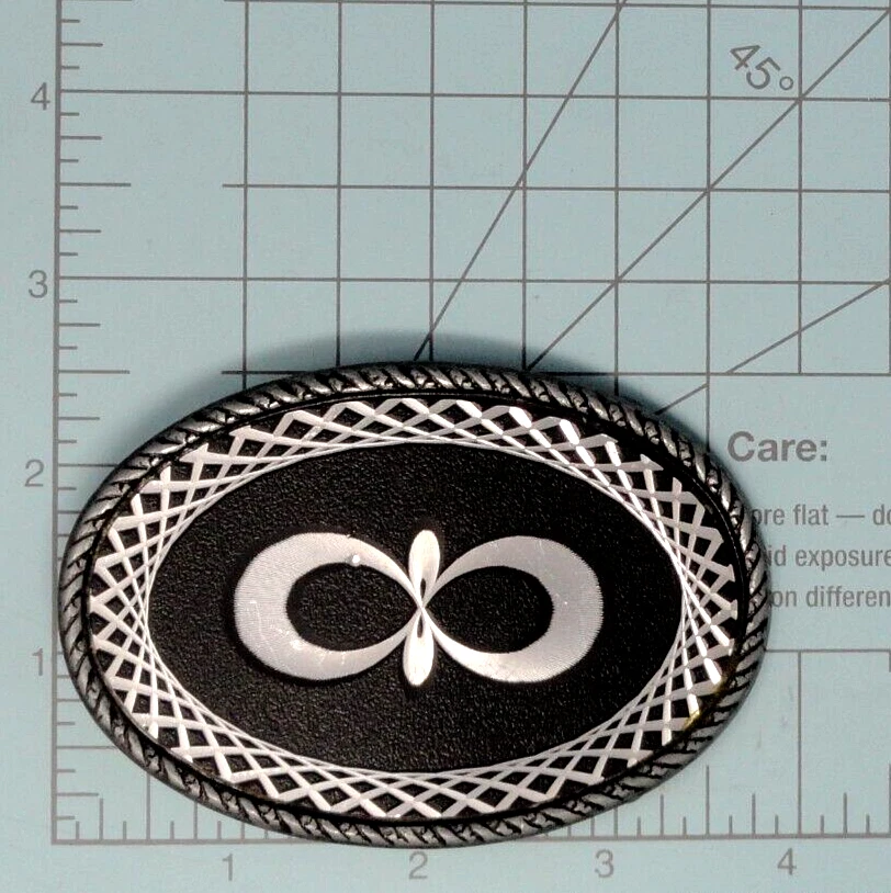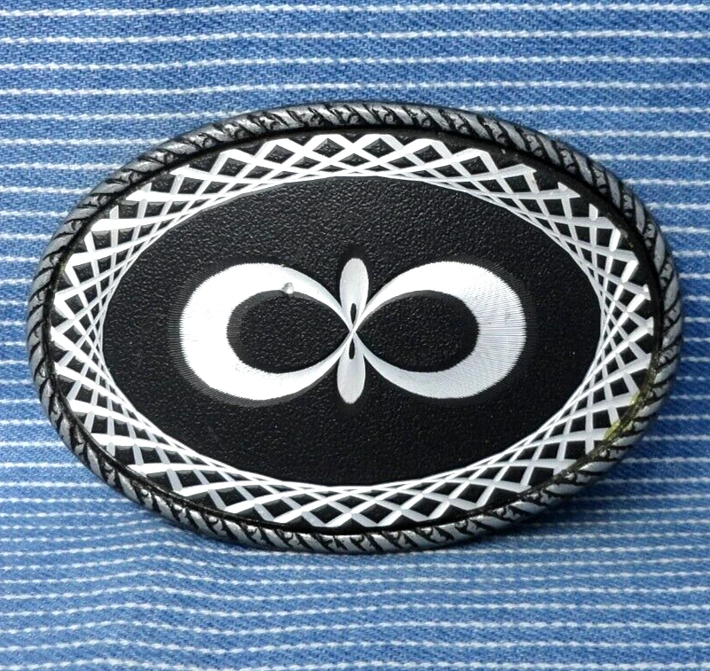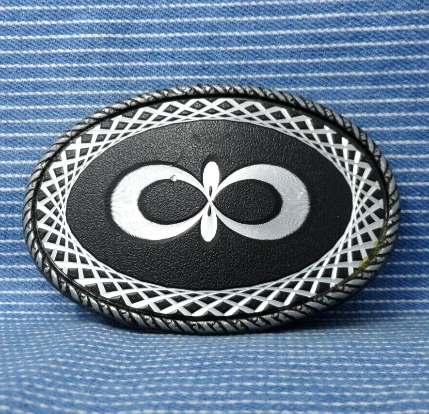Geometric Infinity Graphic Belt Buckle Laser Etched Abstract Vintage 80s ...a fun and interesting old laser etched, geometric infinity design belt buckle. It is a gray metal buckle with some type of acrylic overlay with the design laser etched into it. It is in pretty decent used condition, as shown in the photos it does have some wear and tear from age or use. It measures approximately 3-3/4" x 2-5/8", it fits from a 1-1/2" to a 2" wide belt and it weighs about 2.8 oz. Please ask any questions before you buy and look at all the photos, what you see is what you are buying. Thank you. *Looking for other vintage belt buckles? Please check out my eBay shop where you'll find 1000s more, I will combine shipping on multi-item purchases to help save you some money. Thanks.
