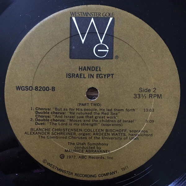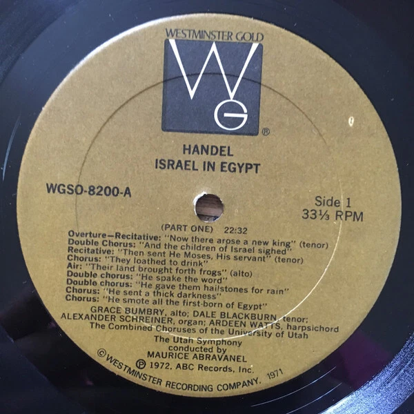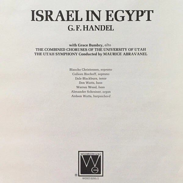 Georg Friedrich Händel, Maurice de Abravanel, Utah Symphony Orchestra, Israel In Egypt (Complete Opera), 2xLP Comment(s) and Condition Notes specific to this listing: ***Record shows no obvious signs of wear. Cover may have sticker, writing, or slight shelf wear.*** Media Condition: Near Mint (NM or M-) Based on visual inspection. Album Cover / 7" Picture Sleeve (GENERIC = NONE) / CD Insert Condition: Very Good (VG) STOCK PHOTOS HAVE BEEN USED WITH LISTING: Photos shown have been pulled from an online database. A picture / company sleeve / CD insert in the photo does not guarantee it is included. If a picture sleeve / insert is included, its Condition will be filled in above this line. SPECIFICATIONS ARE AUTO-FILLED: If there is something specific you require, please ask us to confirm. Thank you for having a look at our collection! Be sure to follow us so you're notified when we post new items. IMPORTANT NOTE: A picture sleeve in the stock photo of a vinyl record does not guarantee a picture sleeve is included with this item. If the vinyl record sleeve condition specifies "Generic" THERE IS NO PICTURE SLEEVE (item will come in a company sleeve or plain sleeve.) Track List : A1. Part One: Overture-Recitative: "Now There Arose A New King" / Double Chorus: "And The Children Of Israel Sighed" / Recitative: "Then Sent He Moses, His Servant" / Chorus: "They Loathed To Drink" / Air: "Their Land Brought Forth Frogs" / Double Chorus: "He Spake The Word" / Double Chorus: "He Gave Them Hailstones For Rain" / Chorus: "He Sent A Thick Darkness" / Chorus: "He Smote All The First-Born Of Egypt" 22:32 . Part Two C1. Part Three: Chorus: "He Is My God" / Duet: "The Lord Is A Man Of War" / Double Chorus: "The Depths Have Covered Them" / Double Chorus: "Thy Right Hand, O Lord" / Chorus: "And With The Blast Of Thy Nostrils" / Air: "The Enemy Said" / Air: "Thou Didst Blow With The Wind" 22:42 D1. Conclusion: Double Chorus: "Who Is Like Unto Thee, O Lord" / Double Chorus: "The People Shall Hear" / Air: "Thou Shalt Bring Them In" / Double Chorus: "The Lord Shall Reign For Ever And Ever" / Recitative: "For The Horse Of Pharoah" / Recitative: "And Miriam The Prophetess" / Solo Soprano With Double Chorus: "Sing Ye To The Lord" 23:56 Catalog Number: WGSO-8200-2 Notes on shipping: All items are packed carefully and shipped quickly. Domestic postage is included with the price. International customers buying multiple items: Please group items into a single order and hold payment until package weight/dimensions can be adjusted. Notes on Media Grading (visual inspection only): Mint: Only used for sealed items. Near Mint: As close to Mint condition as any used item can be. The media shows no obvious signs of wear. Part of an exceptional collection, curated with care, carefully handled, and properly stored. Very Good Plus: A minimal amount of storage or play wear, if present, will be superficial, difficult to see, and will not detract from sound quality. Very Good: Pronounced storage or play wear and, maybe, a few superficial scratches are present. There may be some noise during playback but no skips. Good Plus or Good: Significant noise can be expected on playback due to visible scratches and/or groove wear. LP Record Cover Grading: <