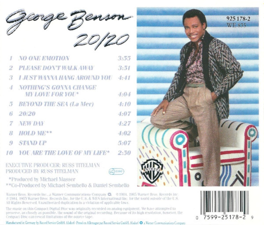 George Benson - 20/20 CD NEW/SEALED Track Listing 1 No One Emotion 2 Please Don't Walk Away 3 I Just Wanna Hang Around You 4 Nothing's Gonna Change My Love for You 5 Beyond the Sea (La Mer) 6 20/20 7 New Day 8 Hold Me 9 Stand Up 10 You Are the Love of My Life THIS CD IS BRAND NEW/SEALED/FULLY GUARANTEED WE ONLY SELL ORIGINAL PRODUCT FROM THE UK/EEC/USA DISPATCH WITHIN ONE WORKING DAY RETURNS POLICY Please Note: If you do not like the product that you have purchased you may return the item (unopened) for a full refund (not including postage). In accordance with UK Law any defective items will be replaced (subject to availability) or fully refunded. Any queries please do not hesitate to contact me. Thank you for your custom. KARL