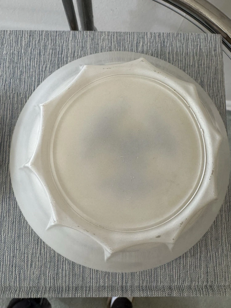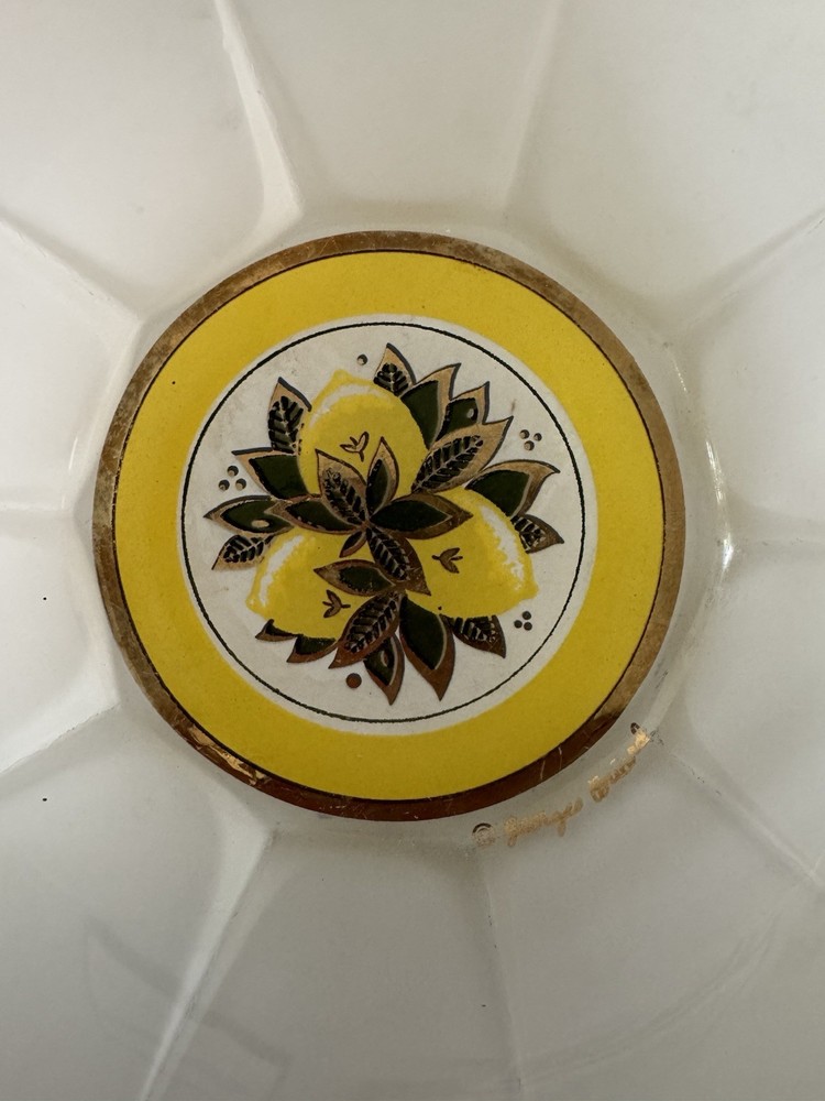 Georges Briard bowl chip and dip set. Mid Century Modern 2 piece Such a beautiful and rare find! Rare GEORGES BRIARD MCM glass LEMONS 2 piece CHIP & DIP scalloped Bowl set. No chips, but a few scratches in the white paint and a bit of wear in gold gilding. Pictures should reflect. The large bowl 8" Diameter 3" Height. The smaller bowl is 4" Diameter and 1.5" Height.
