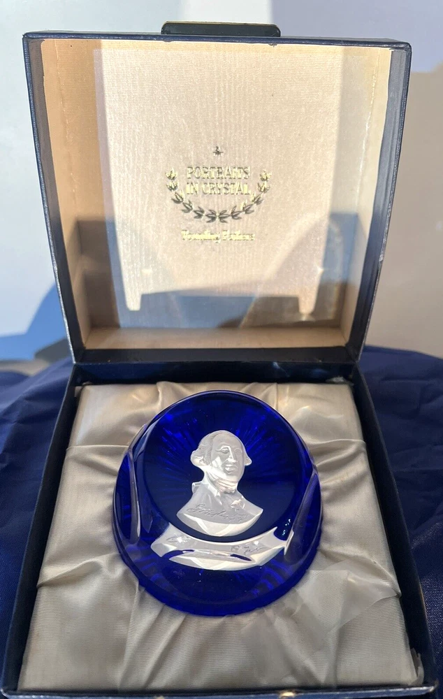 This exquisite paperweight features a stunning design by Crystal D'Albret/Danbury Mint . The multicolor crystal material is expertly crafted to create a unique and beautiful piece. Comes in original box. Part of Founding Fathers Collection. Made in France, this collectible item is a must-have for any decorative collection.