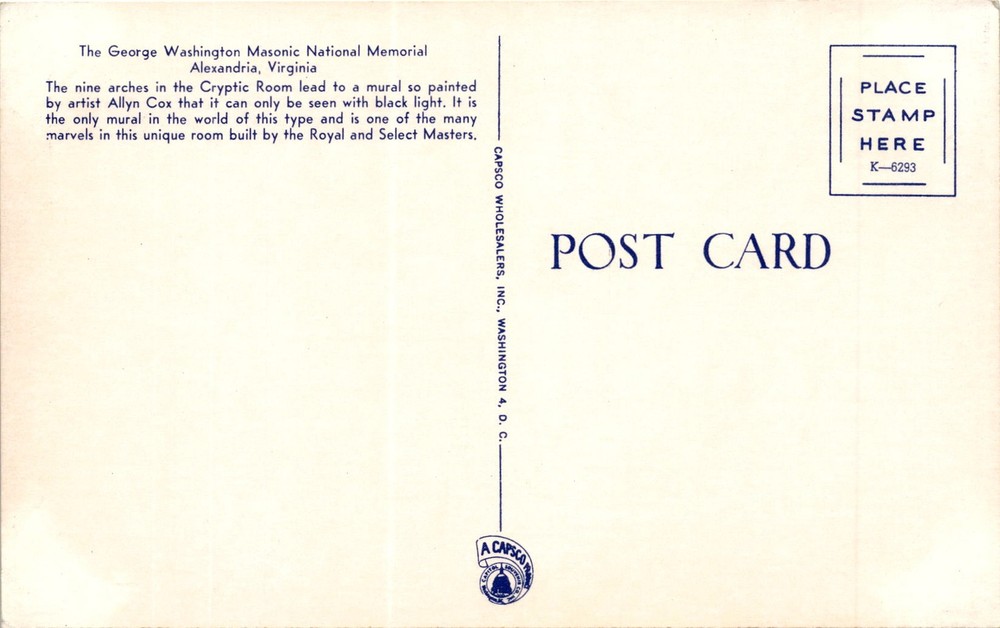 The postcard features The George Washington Masonic National Memorial located in Alexandria, Virginia. The memorial is known for its Cryptic Room, which contains nine arches leading to a mural painted by artist Allyn Cox. This unique mural can only be seen under black light, making it the only one of its kind in the world.