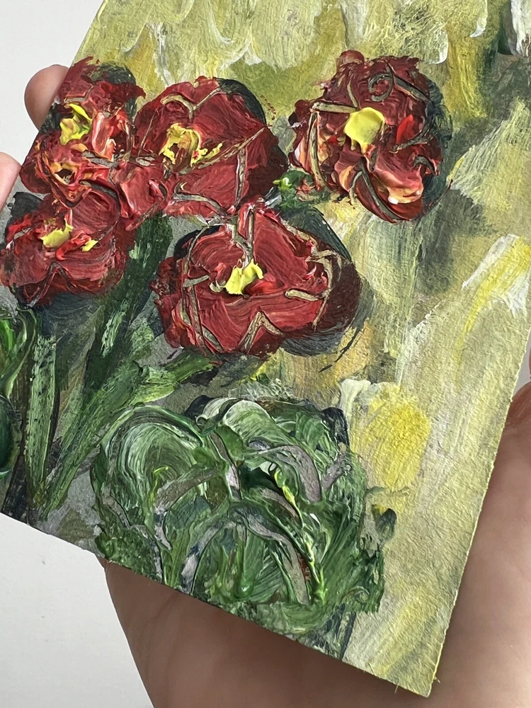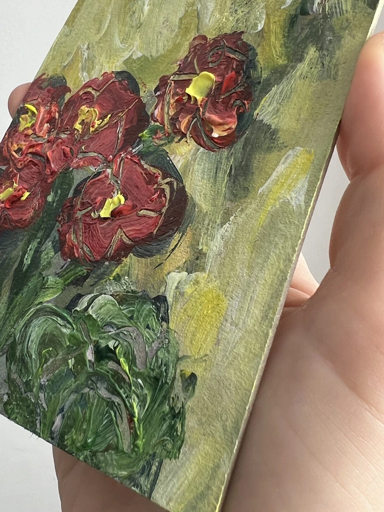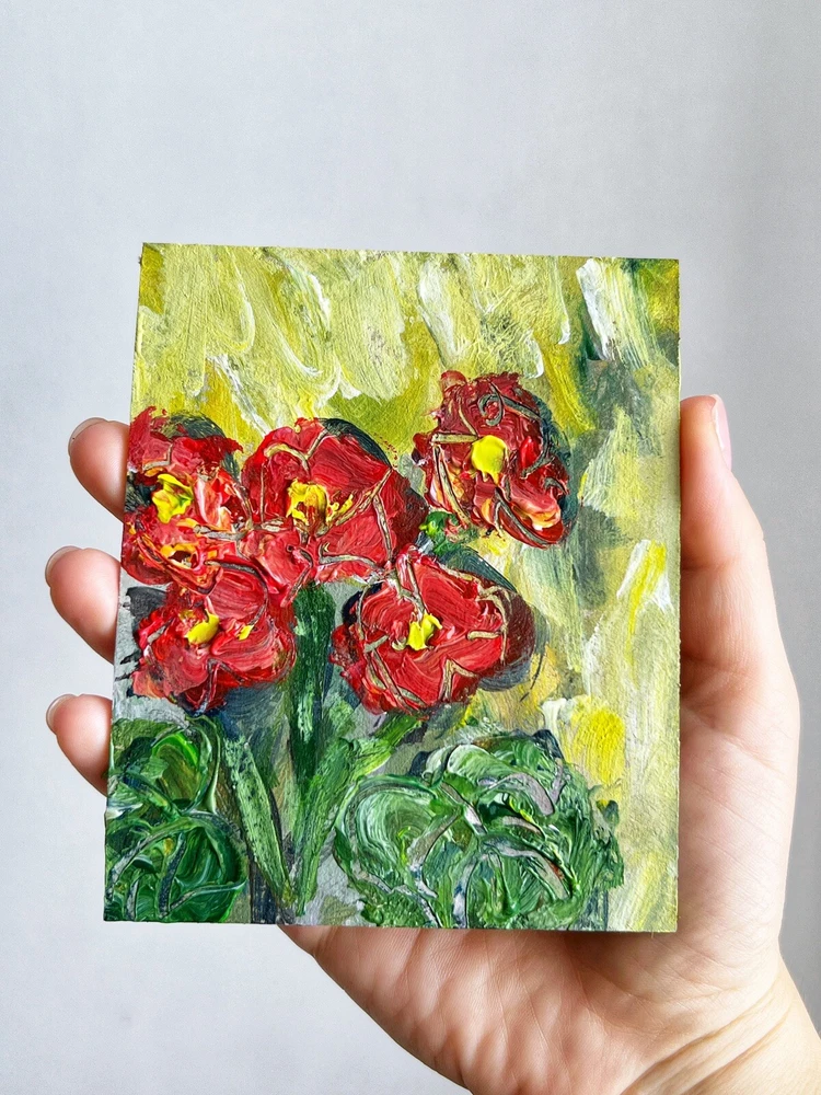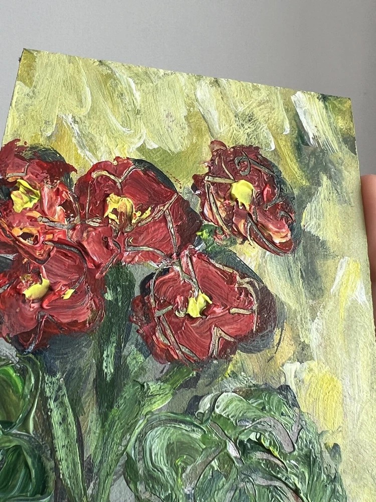 ๐ฟ Geraniums painting. 100% hand painted acrylic original signed small painting 4x5โ. Geranium flower artwork. Miniature floral wall decor. Bookshelf decor. ๐ฟ Original author's acrylic painting on thick cardboard . Unframed. Need a decorative frame. ๐ฟ Size: about ~ 10x12 cm / ~ about 4x5 inches ๐ท Signed from the back by Kateryna Oliynyk . ๐ฟ Materials: professional acrylic paints, cardboard ,. Unframed . Need a decorative frame. Or you can use a small stand / miniature easel.