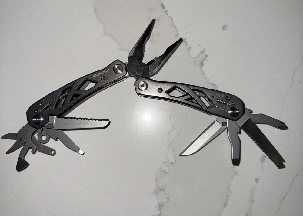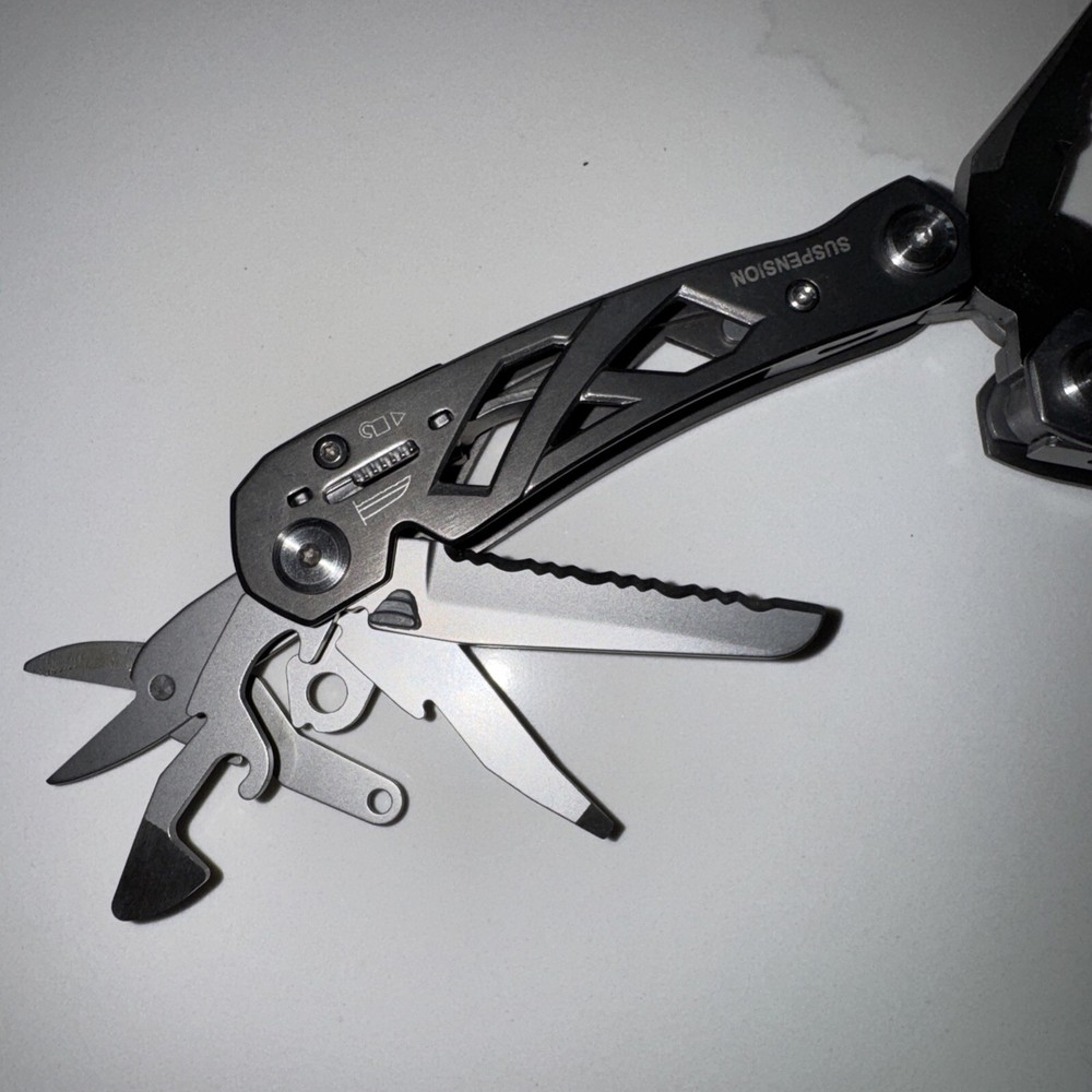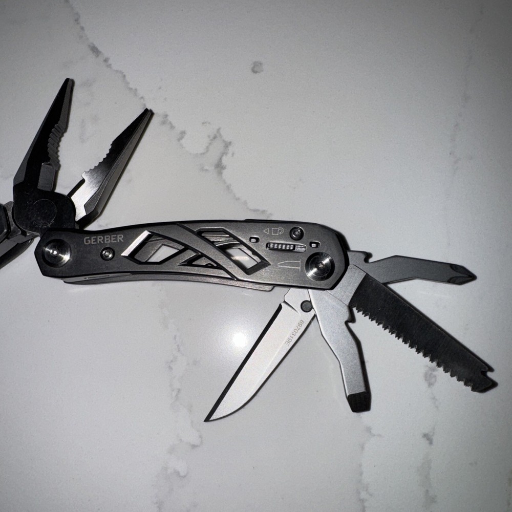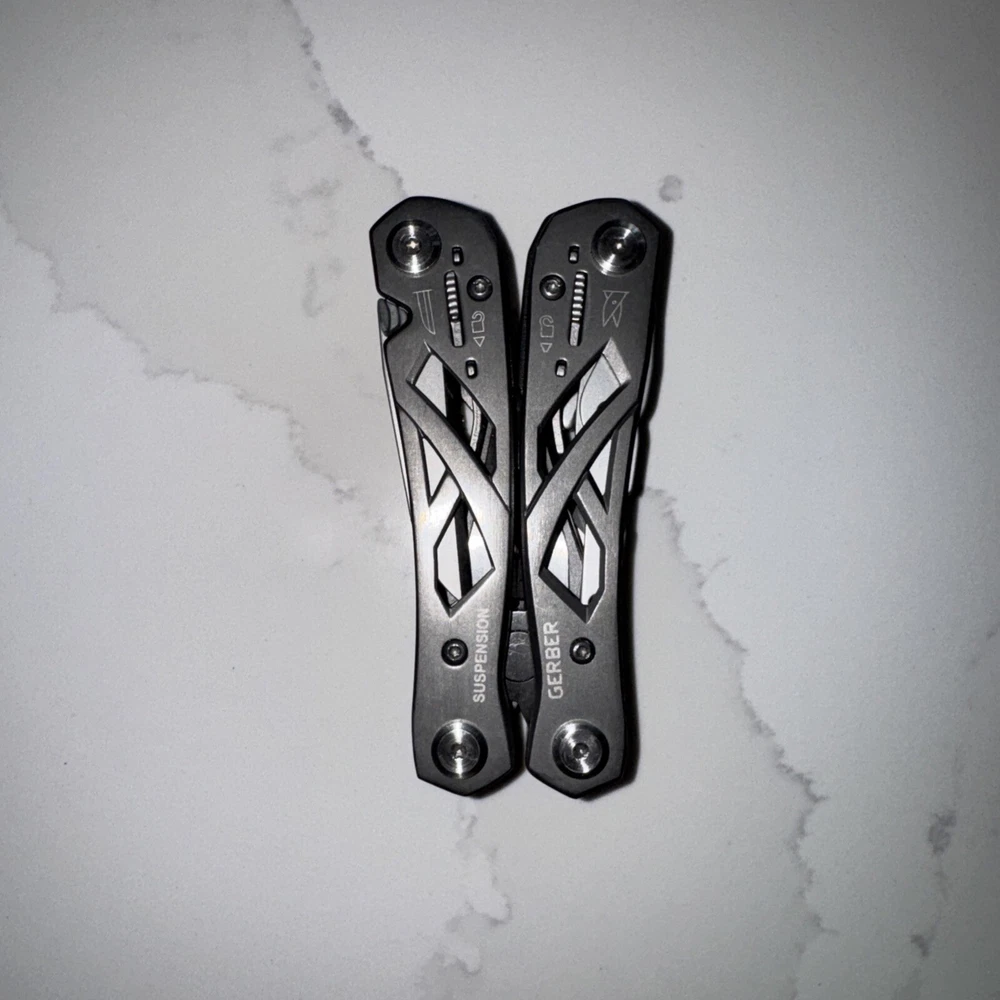The Gerber Suspension Multi-Tool in Gray is a 10-in-1 tool made of stainless steel that comes with a sheath. It has a straight edge blade and a closed length of 4 inches. The tool includes pliers, a knife, a serrated knife, wire cutters, scissors, a medium screwdriver, a bottle opener, a Phillips screwdriver, and a can opener. It is made in the United States and is great for camping and hiking. It can be attached to a lanyard.