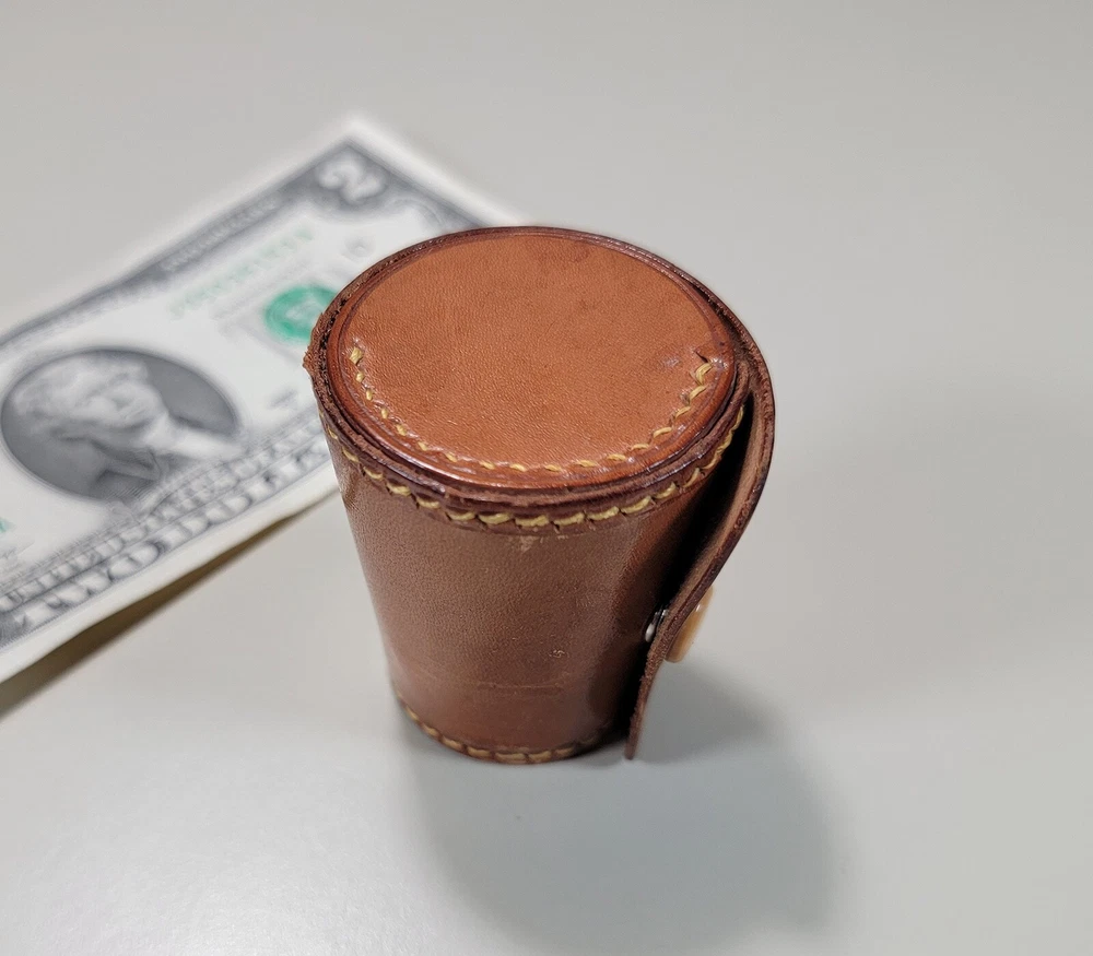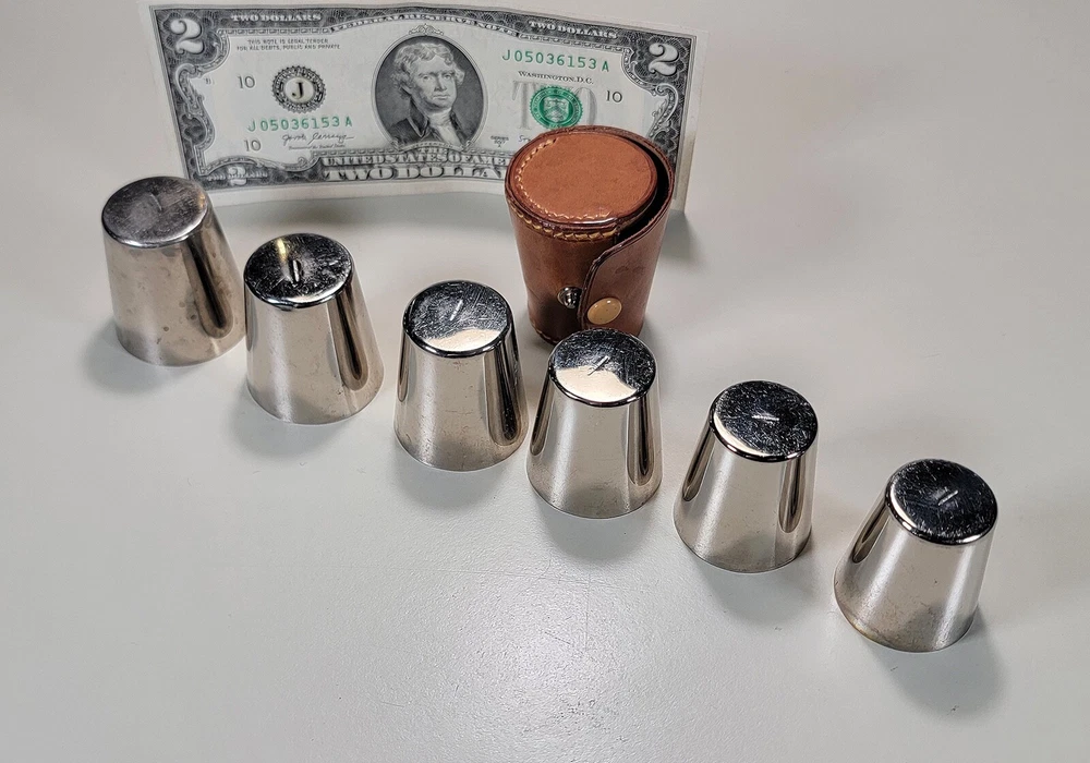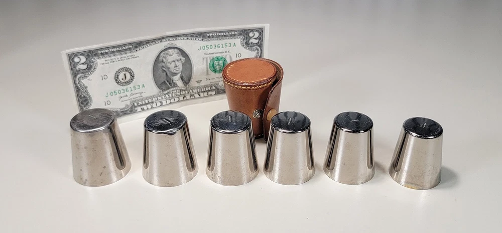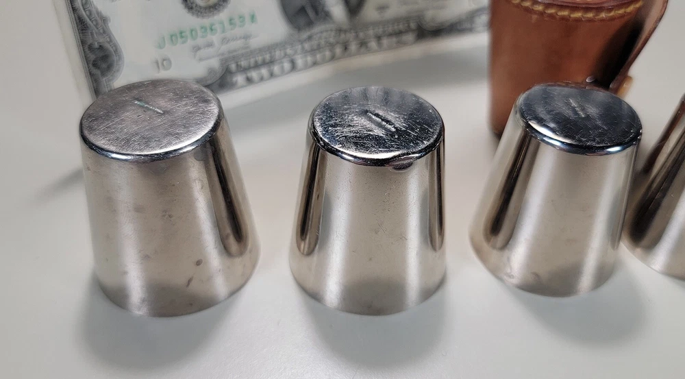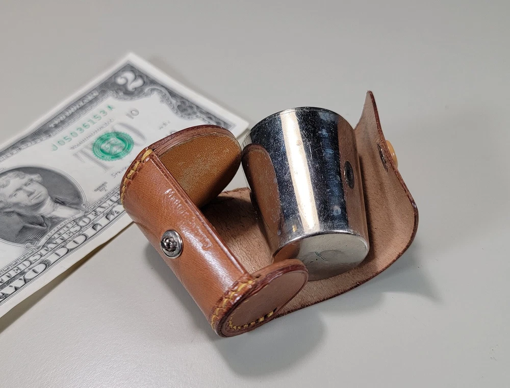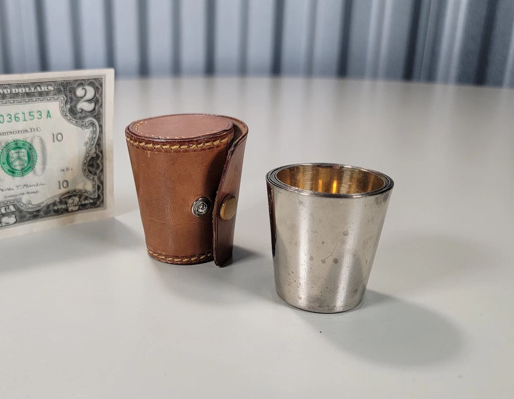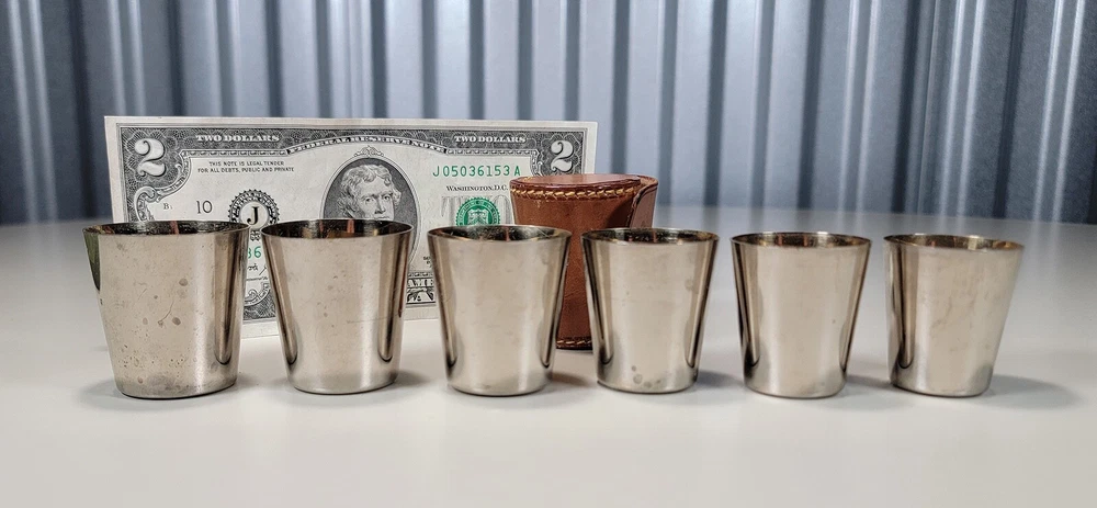 Germany 6 Nesting Shot Glass Set-Leather Case-Travel-Bar/Cocktail DIMENSIONS: Case 2" tall x 1 5/8" diam. Total weight: 94 grams. DESCRIPTION: Vintage nesting shot glass set. 6 nesting shot glasses. Silver- or nickel-plated brass with gilt interior. Maker's marks: all shot glasses as well as the leather case are stamped "Made in Germany". 1930s I believe. Germany. CONDITION: One shot glass (2nd largest) has 2 small shallow dings to the bottom edge. See photos. This does not affect how this shot glass sits or nests. Otherwise all shot glasses and case are in very good original condition with no damage and no significant wear. No restorations. No other dings or dents. No bends, breaks, scuffs. No significant scratches or rubs. No corrosion. No stains to the leather. The snap is functional. No signs of abuse. Old patina as found. Some light scattered oxidation. Light typical handing wear: scattered superficial rubs and scratches. Nothing significant or conspicuous.
