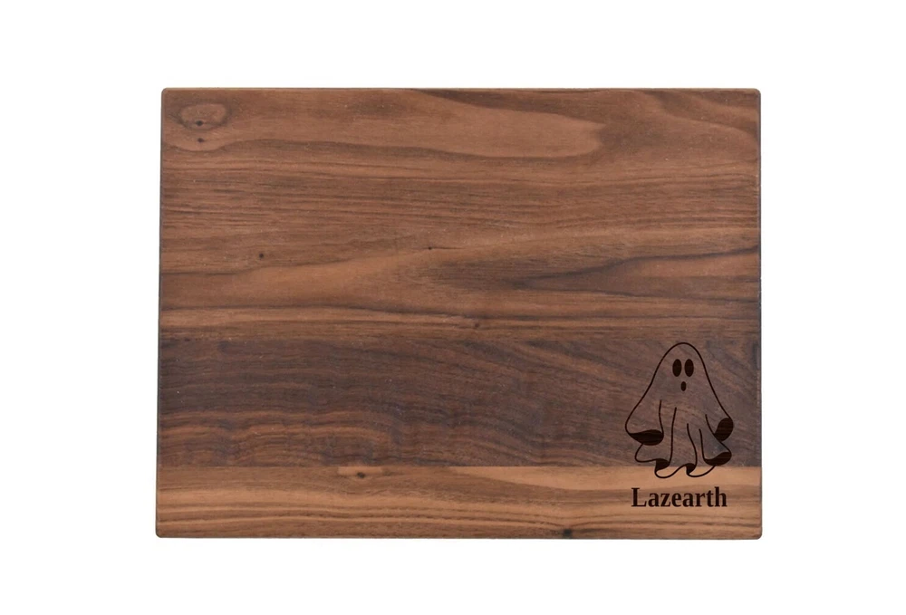 Design: Personalized Ghost Cutting Board or Charcuterie Serving Tray All items ship via USPS - please make sure your address is correct :-) Whether used as a charcuterie serving tray for snacks or cutting board, our bamboo, walnut and cherry custom boards are the perfect addition for the home and make the perfect gift for your loved one celebrating a birthday, anniversary, new home, wedding, etc! *** FEATURES *** • SIZES: We have multiple styles and sizes available. To see our current sizes available, click the drop-down menu. The photo slide contains a photo showing each side by side. Please note, the board with the juice groove only has the groove on the front side of the board. • THICKNESS: Bamboo Boards - Approximately 1/2" Thick; Walnut & Cherry Boards - Approximately 3/4” Thick • UNIQUE: Every board is unique with the grain and coloring varying throughout - no board is the same! • CARE INSTRUCTIONS: Hand wash only with warm water. Do not soak. Please apply mineral oil throughout the board’s life. • PERSONALIZATION/CUSTIMIZATION: Do you want the text placed differently on the board? Please don’t hesitate to contact us. All personalization notes can be entered in the personalization box when checking out. • SHIPPING: All cutting boards ship within 2 to 5 business days. • WHOLESALE ORDERS: Please don’t hesitate to contact us for information about wholesale orders. Processing times for larger orders may change. • NOTE: Colors can vary a bit on different monitors and screens. Any props included in photos are not included. Please be sure to double-check your address to make sure it is accurate for USPS delivery. If a package is returned to us due to an invalid address, the buyer is responsible for all additional shipping charges. We appreciate you supporting small business – best wishes! For items ordered with simple edits, we do not send proofs since the layout doesn't change from the example(s). However, in the event there are requests that change the layout from the example(s), we do send proofs for approval before making the product. If you'd like a proof before we make the product, please note so in the personalization box.
