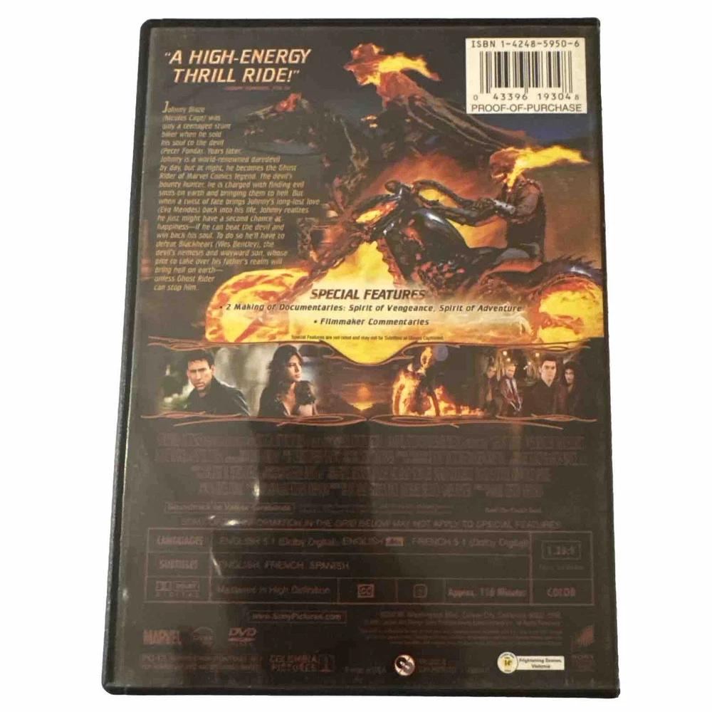 Movie/TV Title:Ghost RiderSeller Notes:“There are small scratches on the Discs. Case does have scuffs and wear. Tested and no skipping.”Genre:Action & AdventureStudio:UnbrandedActor:Nicolas CageFormat:DVDRelease Year:2007UPC:0043396193048Director:Mark Steven Johnsongtin13:0043396193048Edition:Full ScreenFeatures:Full ScreenMPN:Does not applyRating:PG-13