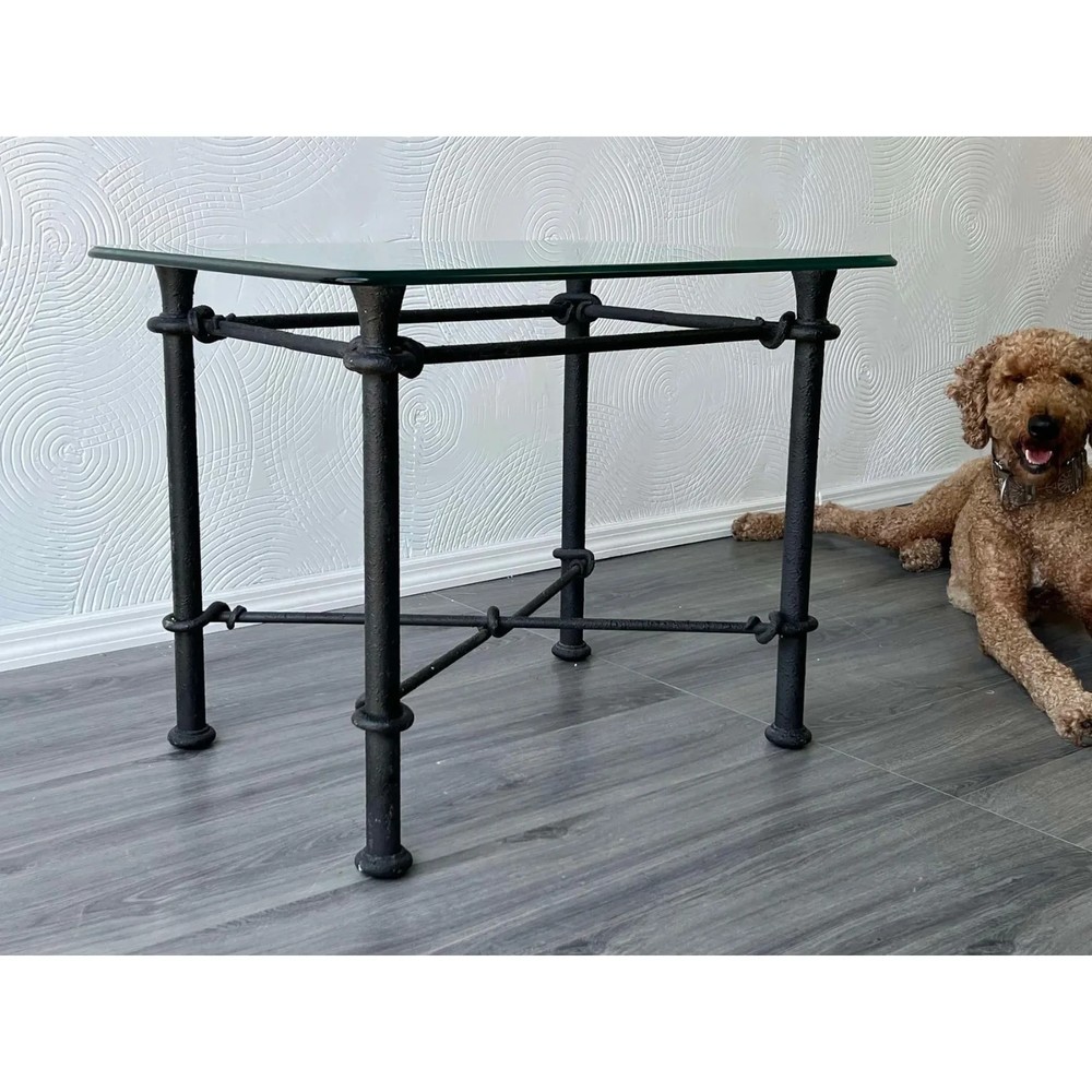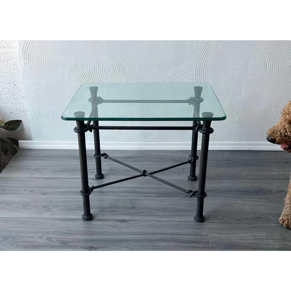 Vintage Giacometti style Iron side table with glass top Dimensions:38"Width x 22"Depth x 23"Height This table has minor wear and overall is great vintage condition See pictures and condition for reference If you have any question, please let us know, thank you Shipping is not included, shipping will be handled separated If you need assistance with shipping or shipping quotes, please let us know, thank you