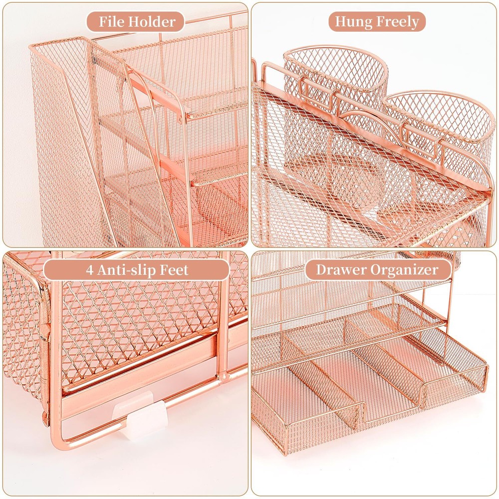 gianotter Desk Organizers and Accessories with File Holder, 4-Tier Desk Accessories & Workspace Organizers with Drawer and 2 Pen Holder, Paper Organizer for Office Supplies (Rose Gold) 📂【Save Space】: The office organizer fully utilizes the vertical space of the desktop, creates the largest possible storage space, accommodates various office desk accessories, and saves space. 📂【Improve Work Efficiency】:The file organizer includes 4 trays, a magazine rack, 2 pen holders and a sliding drawer, helps you quickly identify the contents of each compartment, doubles your work speed, keeps you busy and more creative throughout the day. 📂【High Quality Material】: The file organizer is made of durable metal mesh and solid steel, which has better stability and durability, and the outer layer is epoxy coated, which is rust-resistant and highly durable, ensuring a long service life. 📂【Easy to Assemble】: Easy to assemble the desktop organization within 4 minutes after watching the reading the installation manual, no extra tools required, super easy to assemble, don't worry about any problems! 📂【Happy Purchase】: We offer a 100-day return policy. If you have any questions, please feel free to contact us, we will help you within 24 hours. Shipping We offer FREE shipping on all orders! We ship within Three business days of payment, usually sooner. We use a selection of shipping services such as UPS, FedEx, USPS etc. We only ship to the lower 48 states, no APO/FPO addresses or PO Boxes allowed. Local pickups and combined shipping options are not provided at this time. Return You can return a product for up to 30 days from the date you purchased it. Any product you return must be in the same condition you received it and in the original packaging. Please keep the receipt. Feedback Customer satisfaction is very important to us. If you have any problem with your order, please contact us and we will do our best to make you satisfied. Contact Us If you have any queries, please contact us via ebay. We usually respond within 24 hours on weekdays. Please visit our eBay store to check out other items for sale! Thank you for shopping at our store.