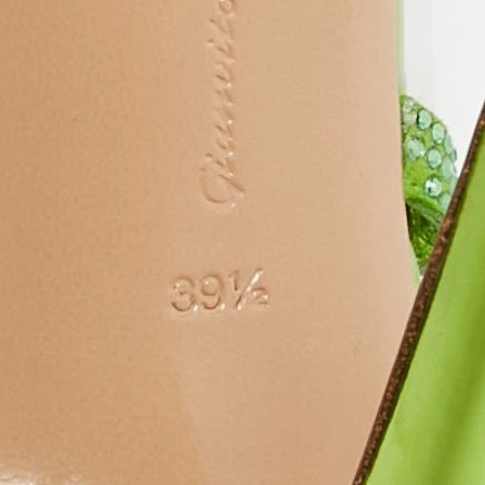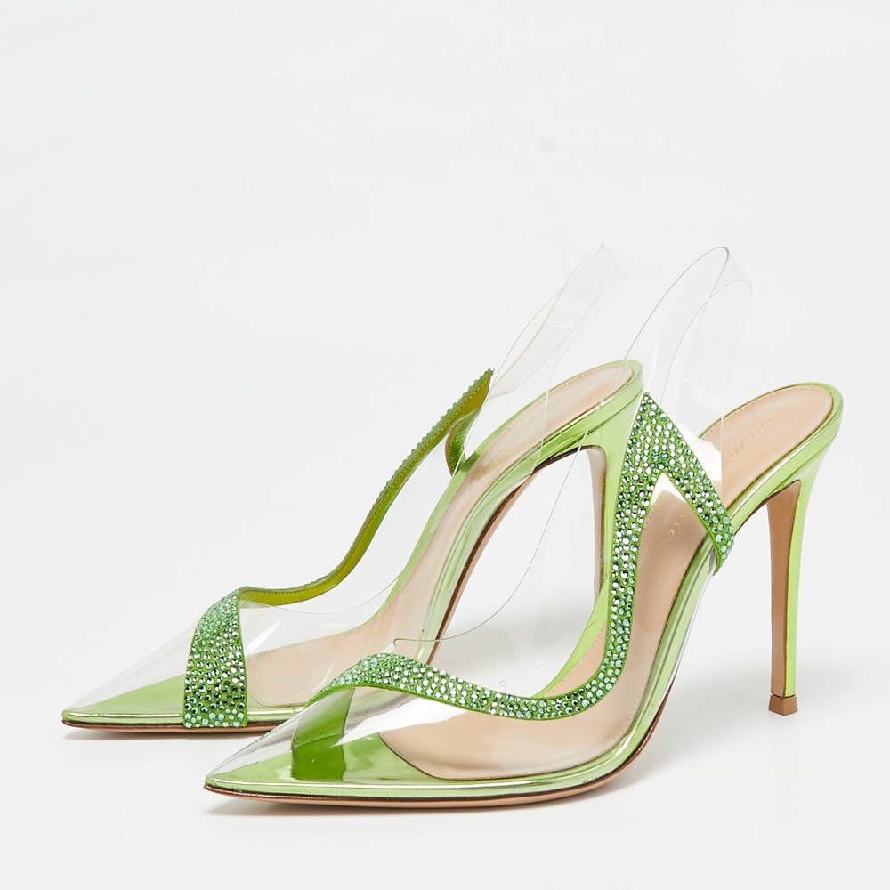 The Gianvito Rossi Hortensia pumps showcase a modern blend of luxury and innovation. Featuring a clear PVC design accented with green suede and intricate embellishments, these pumps offer a bold yet refined aesthetic. The pointed toe and slender stiletto heel create a sleek silhouette, perfect for adding sophistication to evening or formal looks.Certified by The Luxury Closet - This item has gone through a detailed authentication process overseen by our experts. We offer a lifetime guarantee of authenticity on all our items. Import duties, taxes and charges are not included in the item price. These charges are the buyers responsibility. Please check with your country’s customs office to determine what these additional cost will be prior to buying. Our eBay Store About Us Contact Us Add to Favorite Sellers Gianvito Rossi Transparent/Green PVC and Suede Embellished Hortensia Pumps Size 39.5 $481.8 The Gianvito Rossi Hortensia pumps showcase a modern blend of luxury and innovation. Featuring a clear PVC design accented with green suede and intricate embellishments, these pumps offer a bold yet refined aesthetic. The pointed toe and slender stiletto heel create a sleek silhouette, perfect for adding sophistication to evening or formal looks. Product Details Brand Color Transparent Dimensions Material PVC, Suede Size 39.5 Outsole Width 8 cm Outsole Length 24 cm Heel Height 11cm Includes Original Dustbag, Original Box, Info Card Certified by The Luxury Closet This item has gone through a detailed authentication process overseen by our experts. We offer a lifetime guarantee of authenticity on all our items. How We Check The in-house team of experts at The Luxury Closet is highly trained to verify the authenticity and the condition of the luxury products. They ensure that only 100% authentic items are put on sale.The evaluation process is unique with its own mix of assessment criteria and differs according to the category. Each item is evaluated based on the following combination of hallmarks, hardware, stitching, symmetry, material, craftsmanship, stamping, codes, hologram stickers, and packaging. Our authenticators also check if the items have been modified or amended (e.g., aftermarket diamonds, replaced batteries, repaired bags, etc.) International Buyers Import duties, taxes and charges are not included in the item price. These charges are the buyers responsibility. Please check with your country’s customs office to determine what these additional cost will be prior to buying.