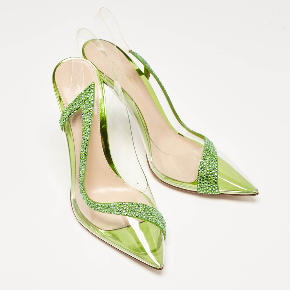 Crafted with a mix of transparent PVC and green suede, these Gianvito Rossi Hortensia pumps offer a striking embellished design. The sleek silhouette and bold details create a statement look that transitions effortlessly from day to night.Certified by The Luxury Closet - This item has gone through a detailed authentication process overseen by our experts. We offer a lifetime guarantee of authenticity on all our items. Import duties, taxes and charges are not included in the item price. These charges are the buyers responsibility. Please check with your country’s customs office to determine what these additional cost will be prior to buying. Our eBay Store About Us Contact Us Add to Favorite Sellers Gianvito Rossi Transparent/Green PVC and Suede Embellished Hortensia Pumps Size 40.5 $420.2 Crafted with a mix of transparent PVC and green suede, these Gianvito Rossi Hortensia pumps offer a striking embellished design. The sleek silhouette and bold details create a statement look that transitions effortlessly from day to night. Product Details Brand Color Transparent Dimensions Material PVC, Suede Size 40.5 Outsole Width 8 cm Outsole Length 24.5 cm Heel Height 11 cm Includes Original Dustbag, Original Box, Info Card Certified by The Luxury Closet This item has gone through a detailed authentication process overseen by our experts. We offer a lifetime guarantee of authenticity on all our items. How We Check The in-house team of experts at The Luxury Closet is highly trained to verify the authenticity and the condition of the luxury products. They ensure that only 100% authentic items are put on sale.The evaluation process is unique with its own mix of assessment criteria and differs according to the category. Each item is evaluated based on the following combination of hallmarks, hardware, stitching, symmetry, material, craftsmanship, stamping, codes, hologram stickers, and packaging. Our authenticators also check if the items have been modified or amended (e.g., aftermarket diamonds, replaced batteries, repaired bags, etc.) International Buyers Import duties, taxes and charges are not included in the item price. These charges are the buyers responsibility. Please check with your country’s customs office to determine what these additional cost will be prior to buying.