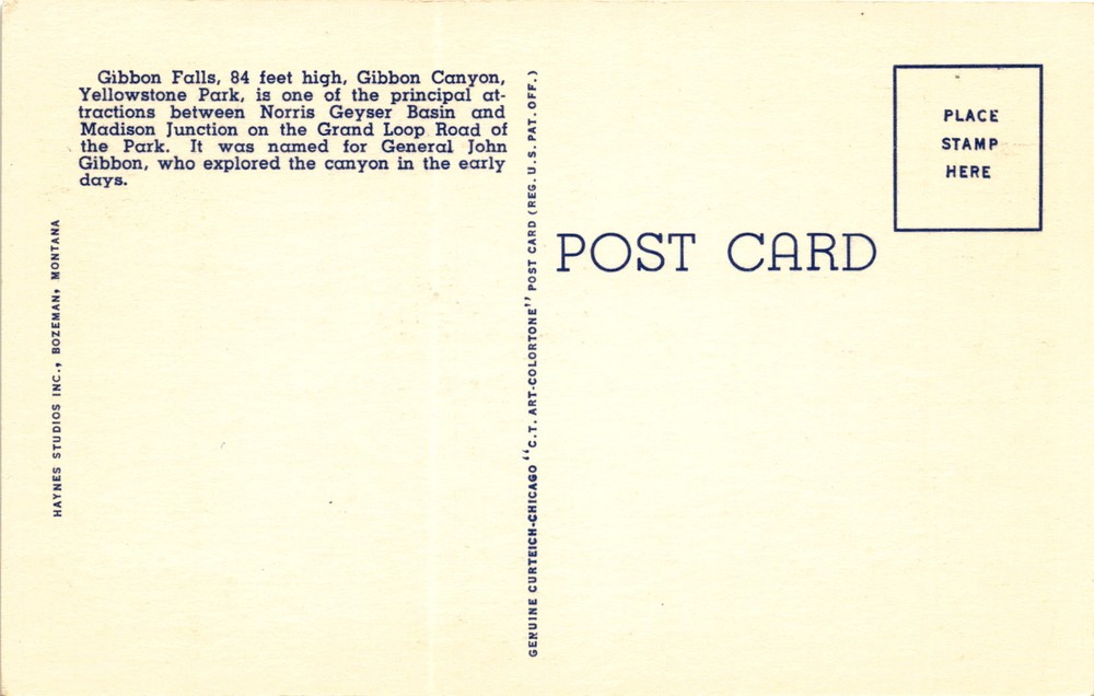 MAKE AN OFFER. THE MORE YOU BUY THE BETTER DEAL I WILL ACCEPT The postcard features Gibbon Falls, a waterfall in Yellowstone National Park, with a height of 84 feet. It is located in Gibbon Canyon, between Norris Geyser Basin and Madison Junction on the Grand Loop Road of the park. The falls were named after General John Gibbon, who explored the canyon in the early days.