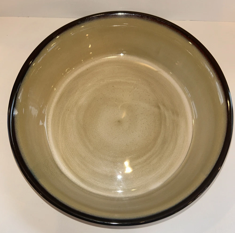 This Gibson serving bowl features an animal print pattern in beige, made of ceramic with a diameter of 9 inches and a height of 2.5 inches. The art pottery production style from the 2010-2019 time period showcases a modern aesthetic, with a production technique of pottery from China. The set includes a single serving bowl, suitable for various dining occasions. Handmade status is unknown, but the overall design and quality make it a beautiful addition to any table setting. kk403