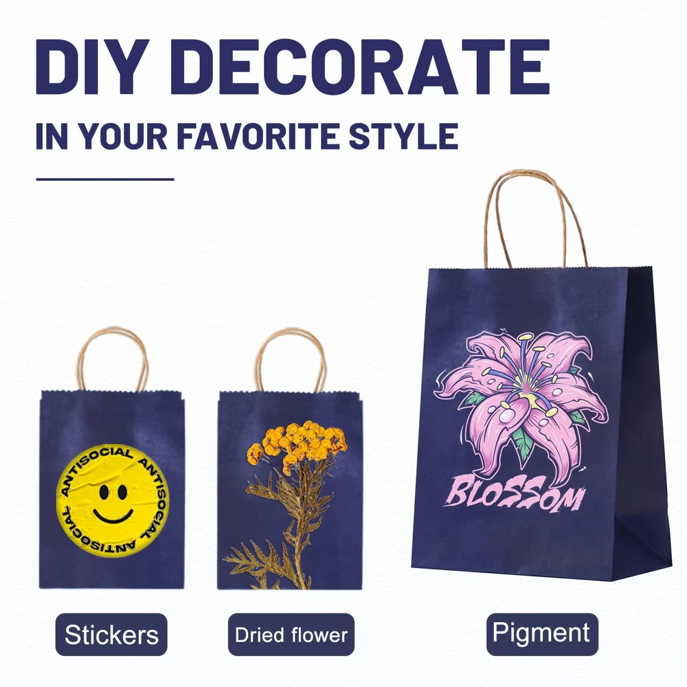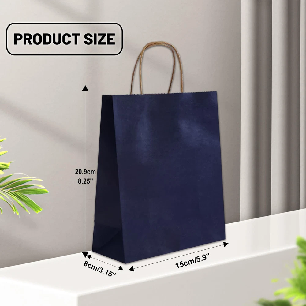 GREAT VALUE GIFT BAGS: These gift bags are made up of 100 pieces measuring 8.25" x 5.9" x 3.15" with handles made of high quality, sturdy paper material such as kraft or recycled paper. The handles are reinforced with two repeated coats of glue for added strength and durability and can carry a lot of weight without tearing. ECO-FRIENDLY CHOICE: These navy blue gift bags with handles are made from recycled materials and sustainable resources, they are biodegradable, recyclable, non-toxic and odorless,non-polluting, making them a great choice for environmentally conscious individuals. Using these bags instead of traditional plastic bags helps to reduce waste and promote sustainability. CONVENIENT GIFT BAGS: Handles provide an easy and comfortable way to carry packaging, and are often long enough to fit comfortably in the hand, whether it's for groceries, retail purchases or promotional items. Sturdy construction and ease of use make them a practical and stylish choice for packaging needs. DIY DECORATION: This gift bags are not printed with crafts, use your imagination and unleash your creativity to personalize them in any way you like. They can be decorated with ribbons, bows and other decorations to add a festive touch or personalized message. Additionally, they can be imprinted with logos or brand names, making them a great choice for businesses looking to enhance their brand image or enhance their customer experience. MULTIFUNCTIONALITY: This gift bags you can use them to hold a variety of small to medium crafts or light artwork, they are also ideal for fairs and farmers markets. In addition, they can be perfectly used for takeout orders or as shopping bags for customers without fear of damage. Also suitable for Christmas bags, Valentine's Day gift bags, shopping bags, holiday gift bags, party gift bags, retail bags, merchandise bags, wedding welcome bags.