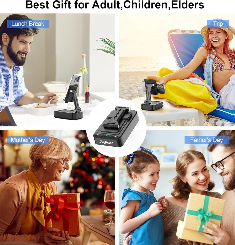 Gifts for Men Women, Joymate Bluetooth Speaker Phone Stand with Charging Function 360° Rotable Adjustable Cell Phone Holder HD Surround Sound for Desk Fits All Phones,Tablet (Black) Item Description 3 in 1 Bluetooth Speaker Charging Stand-With built in speaker, charging port and mic, it can not only be used to listen to music, answer calls, but also charge phone of power outages. Supports a wide range of smartphones, tablets. Practical gift for Birthday, Mother's Day, Father's Day, Christmas etc. 3600mAh Battery and Non-slip Design- Our cell phone holder comes with a large capacity battery which serves as a power bank (not wireless charging), and the play time is up to 40h at 50% volume in fully charged state. Plus, remaining power is visible from the battery indicator light. Panel and base are covered with silicone pads which can prevent slipping. Bluetooth 5.3 & HD Stereo Subwoofer Speaker- This Bluetooth speaker equipped with advanced 5.3 Bluetooth signal supports stronger connection, range up to 32.80ft. It combines stereo and subwoofer to make clear sound that complies with every beat and less distortion, good for creating an atmosphere for party or festival. Foldable and Angle Adjustable- Being foldable and weighs only 13.05oz, it is easy to fit into your bag/backpack, ideal for enjoying music anytime and anywhere. Adjustable height and angle for comfortable watching view or taking hands-free showcase video, save your neck and wrist. 360° Click Rotation and Perfect Gift- The phone stand can rotate 360° and emit a click sound, making it easy to get best view or play with it to alleviate stress. The technophile will totally love it. Cool and functional gift for him/her. Being able to connect to computer via the original data cable. Please feel free to contact us if you have any problem. › See more product details Faster link speed and stronger signal, with a maximum connection range of 10 meters. Easy to adjust to the comfortable angle and firmly hold electronics. Payment We accept payment only through PAYPAL Shipping We ship products worldwide through standard express courier service, it will reach within 7 to 10 days to abroad buyers, we ship the product after recieved clear payment and give full information about shipment to the buyer Return We accept product return within 7 to 21 days from delivery date but product should be in original position and not in damaged condition,the return shipping charges will be buyer responsibility