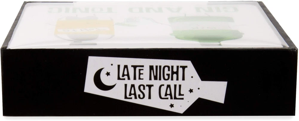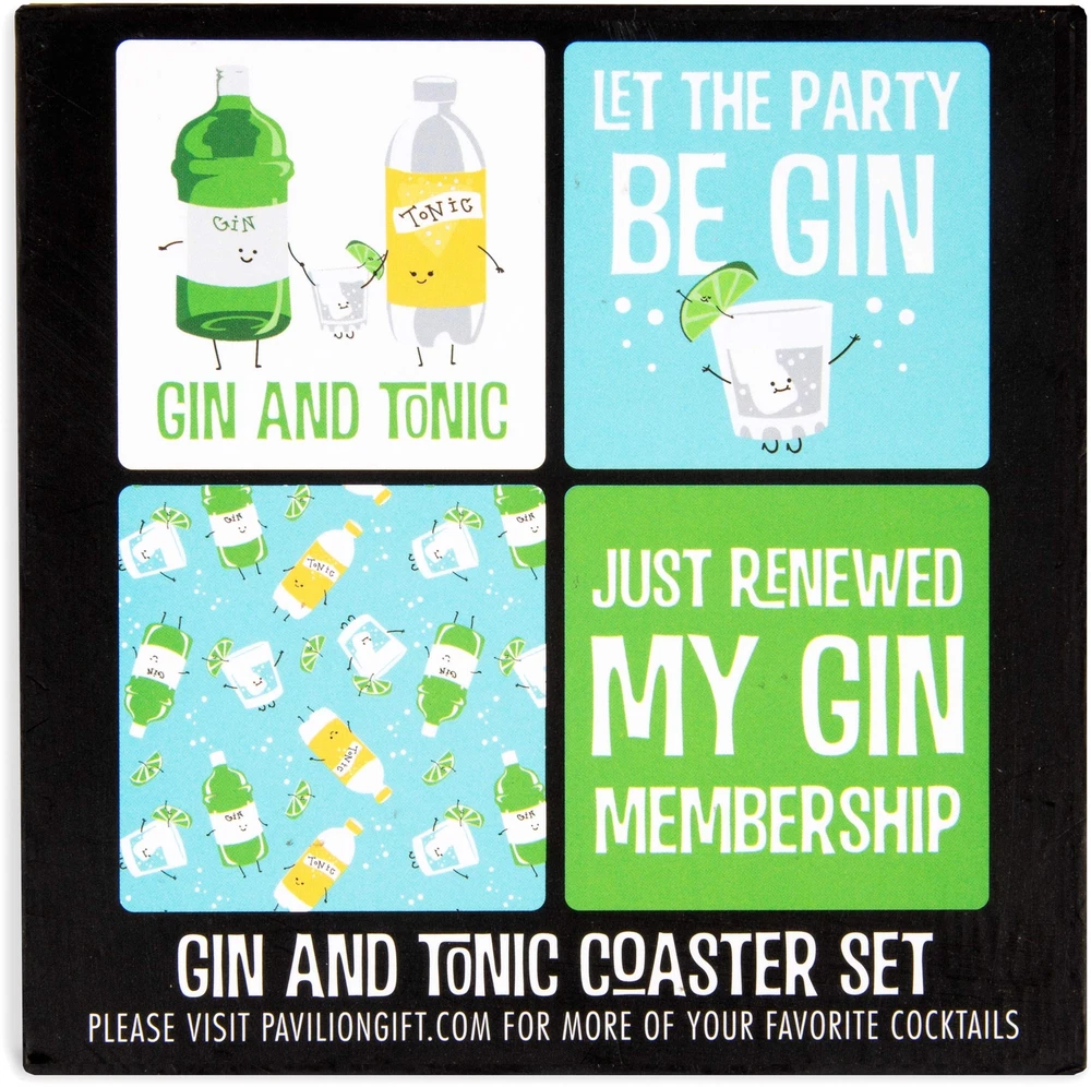 PREMIUM QUALITY: Set of four coasters, packaged in a printed open-faced box, are made from MDF with a cork backing. IN-HOUSE DESIGN: "Gin And Tonic", "Let The Party Be Gin", and "Just Renewed My Gin Membership" texts and glass and bottle icons are printed onto individual coasters. PERFECT FOR GIFTING: Perfect for those who wish to show their love of gin and tonic. CARE INSTRUCTIONS: Wipe clean with a damp cloth. MORE PRODUCTS: Lounge pants, t-shirts, and glassware in the same style are also available.