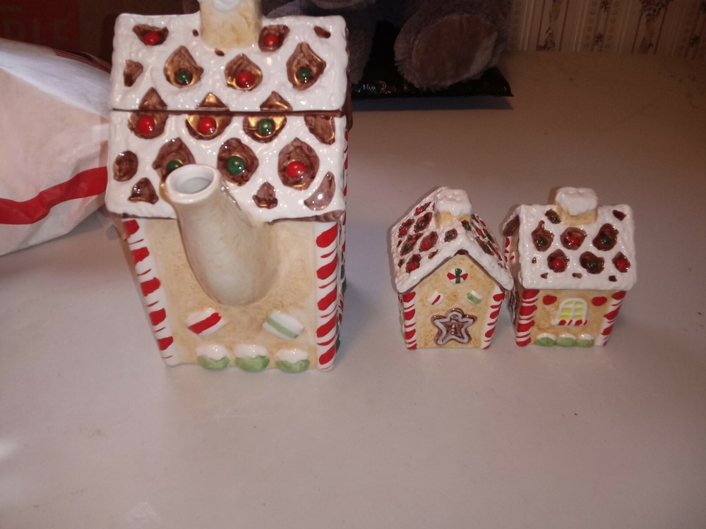 Gingerbread House Collection Teapot Salt and Pepper Set Cooks Bazaar Christmas. New Open Box. Brand New Condition