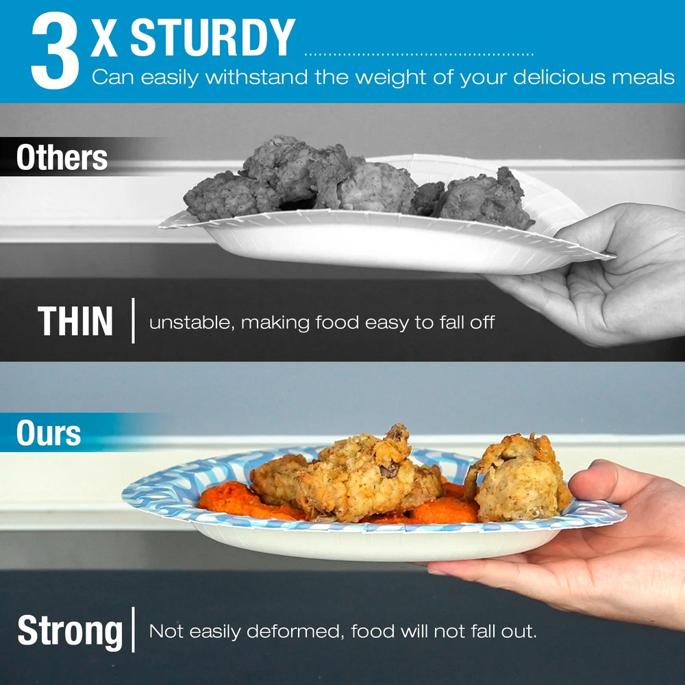 Climate Friendly & Sturdy - Our 10-inch paper plates are made from renewable materials. Enjoy the convenience of disposable dinnerware without compromising on quality. Perfect for picnics, parties and everyday meals, they can hold the weight of your delicious meals. Large & Versatile - 10-inch paper plates provide ample room for your culinary masterpieces. Whether you're serving a hearty dinner or a stack of delectable desserts, our plates can handle it all. Mess Free Design - Say goodbye to leaks and spills with our innovative rimmed edge design. These paper plates are engineered to prevent food from sliding off and liquids from soaking through. Time-Saving & Convenient - Simplify your life with our bulk pack of 100 plates. No more washing dishes or dealing with piles of dirty cookware. Stylish & Affordable - Elevate your table setting without breaking the bank. Our 10-inch paper plates combine affordability with a sleek, minimalist design. They're versatile enough for casual gatherings and elegant enough for special occasions, making them the smart choice for budget-conscious hosts with a taste for quality.