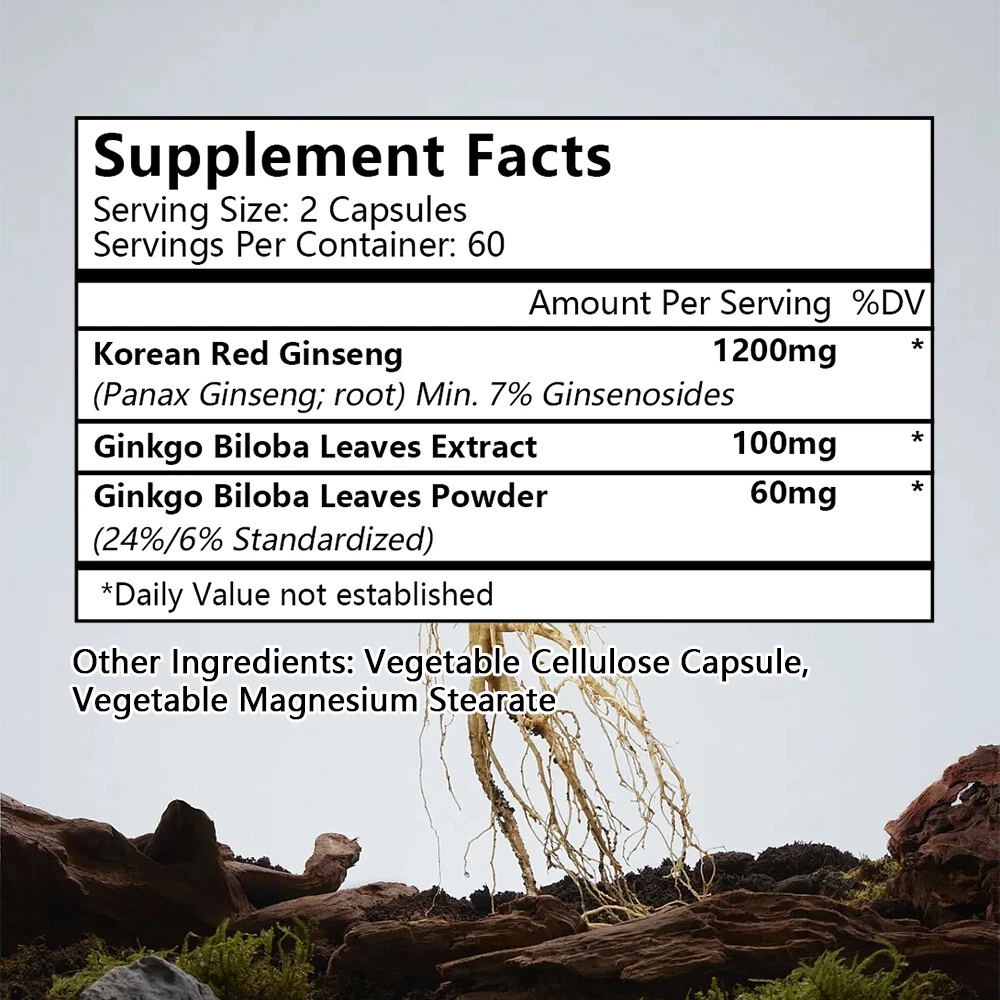 FOCUSED ENERGY FOR YOU MIND & BODY - Are you looking for something that gives you long-lasting energy? Our combination of Korean Red Panax Ginseng (1200mg) + Ginkgo Biloba Leaves Extract (100mg) and Ginkgo Biloba Leaves Powder (60mg) works synergistically together to produce focused energy that allows you to be your most productive self. 2-IN-1 POWERHOUSE FORMULA: This combination of Korean Red Panax Ginseng, 100% pure and authentic and features high ginsenosides comes from premium growers with Ginkgo Biloba Extract and Leaves Powder. Standardized for 24% flavone ginkgo glycosides and 6% terpene lactones. Include it in your diet today! NATURAL ALTERNATIVE - Every day, millions of Americans drink coffee and energy drinks to “stay productive” or “get ahead.” The problem is most of what we choose is loaded with sugar, artificial sweeteners, preservatives, and several unhealthy side effects. With our Korean Red Panax Ginseng + Ginkgo Biloba formula, you’ll enjoy the benefits of Ginkgo Biloba is one of the oldest and most-commonly-used supplements o improve mind and focus combine it with Korean Red Ginseng.