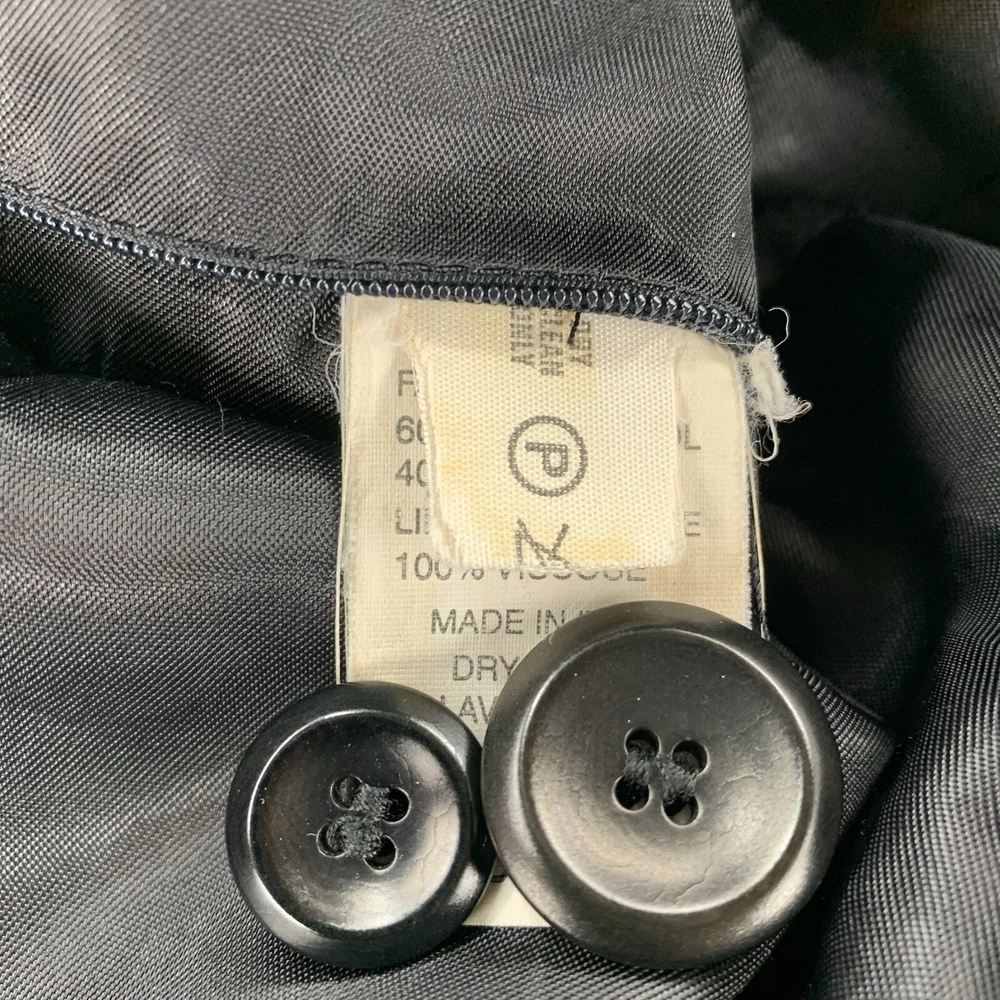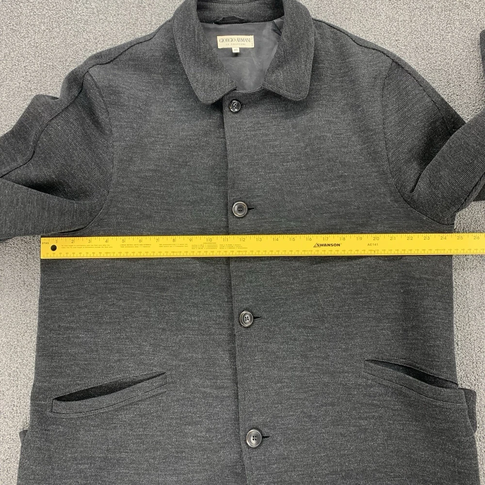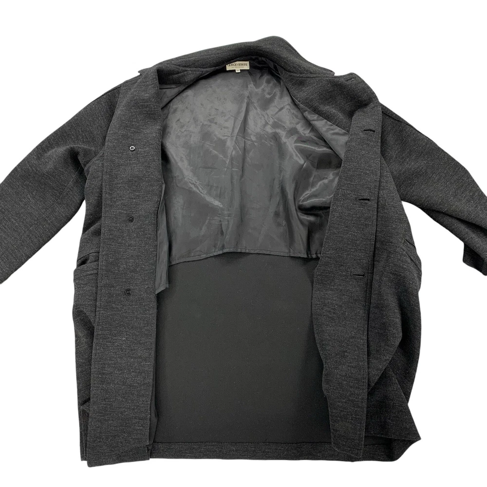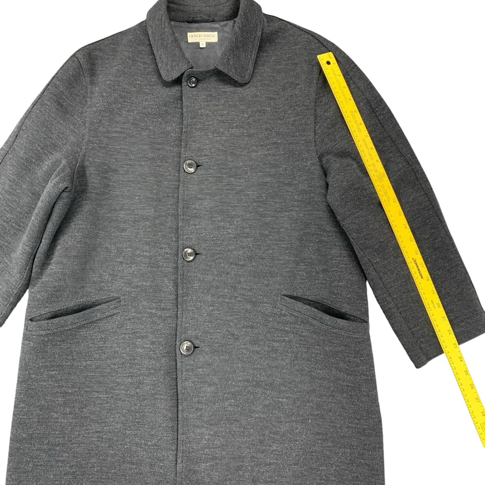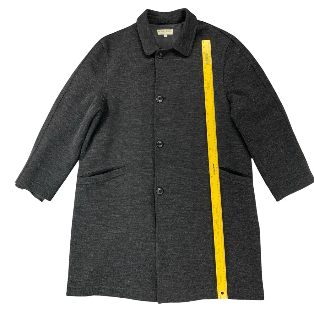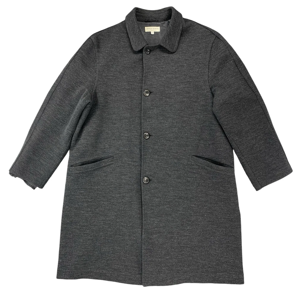 Outer Shell Material: 80% Wool Personalize: No Season: Fall, Spring, Winter Type: Coat Occasion: Business, Casual, Formal, Party/Cocktail, Travel, Workwear Fabric Type: Knit Size: 40 Garment Care: Dry Clean Only Brand: Giorgio Armani Lining Material: Viscose Insulation Material: Polyester Country/Region of Manufacture: Italy Accents: Button Closure: Button Model: Armani Size Type: Regular Handmade: No Product Line: Armani Pattern: Solid Performance/Activity: Walking Vintage: Yes Theme: 90s, Classic, Designer Features: Lined, Pockets Color: Gray Jacket/Coat Length: Long Collar Style: Spread Style: Overcoat Department: Unisex Adults