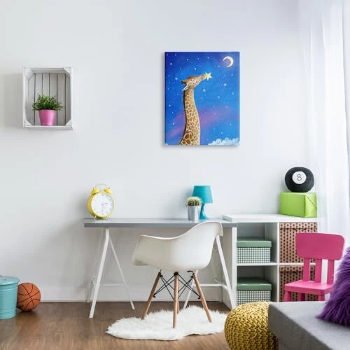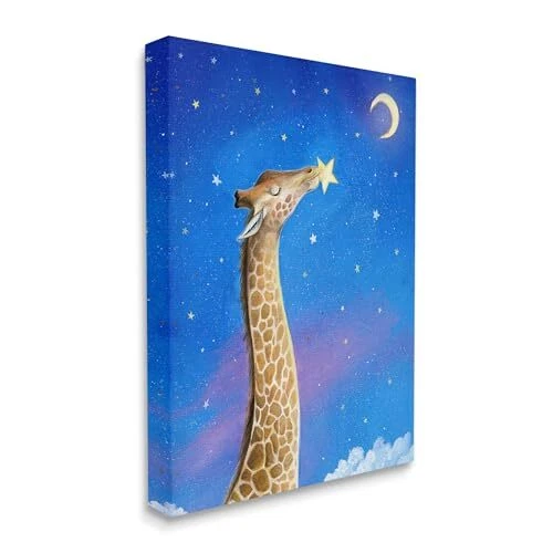 Stretched Canvas Sizes Include Standard: 16 x 1.5 x 20 Large: 20 x 1.5 x 30 X-Large: 30 x 1.5 x 40 Oversized: 36 x 1.5 x 48 Wall Art is Ready to Hang with Hardware Free Hanging. No installation required. For Easy Set Up Lean or Layer Artwork on Shelf or Against Wall. Our stretched canvas is created with the highest standards. We use only the highest quality inks and canvas on our in house Mimaki printers, and then hand cut and stretch each piece over a 1.5 inch thick wooden frame for hanging. Made In USA. Artwork Relates To: Night, Animal, Giraffe, Mammal, Wildlife, Astronomy, Moon, Stars, Clouds Design by Hannah Spiegleman