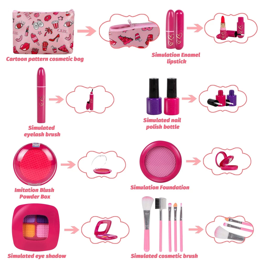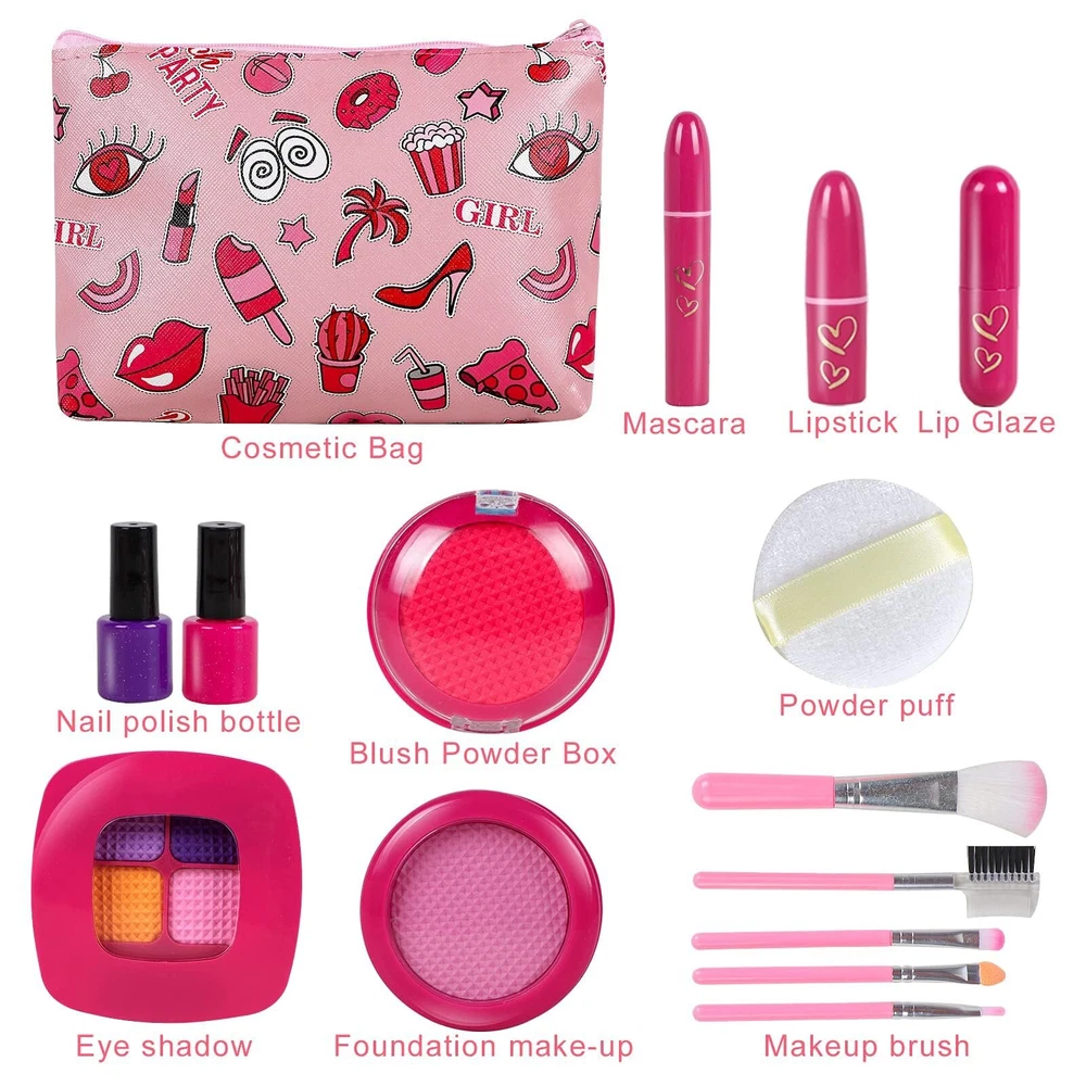 👩👧👧【Pretend Make Up Looks Like Mom’s】Pretend makeup kit looks like real makeup cases but filled with colorful EVA foam, which comes with lipstick, lip gloss, blusher, eyeshadow, powder, makeup brushes. Without applying to skin, this toy makeup is perfect for baby girls who wants to be just like mom. Save Moms Expensive Cosmetics and Unleash Kids’ Creativity. ❤️【💯Safe Quality Bring More Fun💯】ASTM and CPC certificated Toddlers Makeup Kit. Non-toxic material with eco-friendly foam cosmetic toys with rounded edges to avoid injury and ensure children safe play and no mess to clean up, also don’t worry about toddler’s sensitive skin. 💄【Learn by imitating and pretending】Girls love to imitate their moms apply makeup. play makeup set for toddlers is designed to inspire imaginary and creative play, allowing your little girls enjoy to 'put makeup’ on herself, her dolls or other people. 🛍️【Package Include】The pretend make up toys kits includes 15 total pieces: cosmetic bag with zipper, quad compartment bright eye shadow, bronzer and blush combo, lip gloss, eye catching foundation with mirror, makeup brush set, lipstick, and nail polishes. 💝【Best Gifts for Girls】Our fake makeup set is not a real cosmetic that there is a colored soft foam made of kid-safe foam and plastic instead of an actual. The kids make up sets is designed for 3 4 5, 6-8 year old toddler girls. Good choice for birthday, festival and Christmas as a gift for little girl. Let the imagination run wild and enjoy hours of play with a complete pretend make up set, designed especially for your little princess!