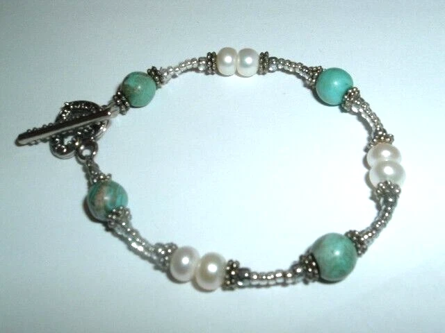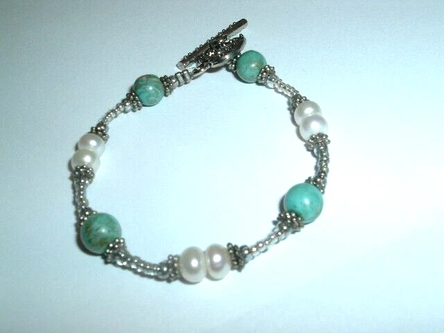 From Phoenix, Arizona, a girls bracelet of howlite turquoise, white pearls and white crystal spacer beads measuring 7" long. Has toggle clasp with a silver heart, condition is excellent. An excellent gift. We combine ship.