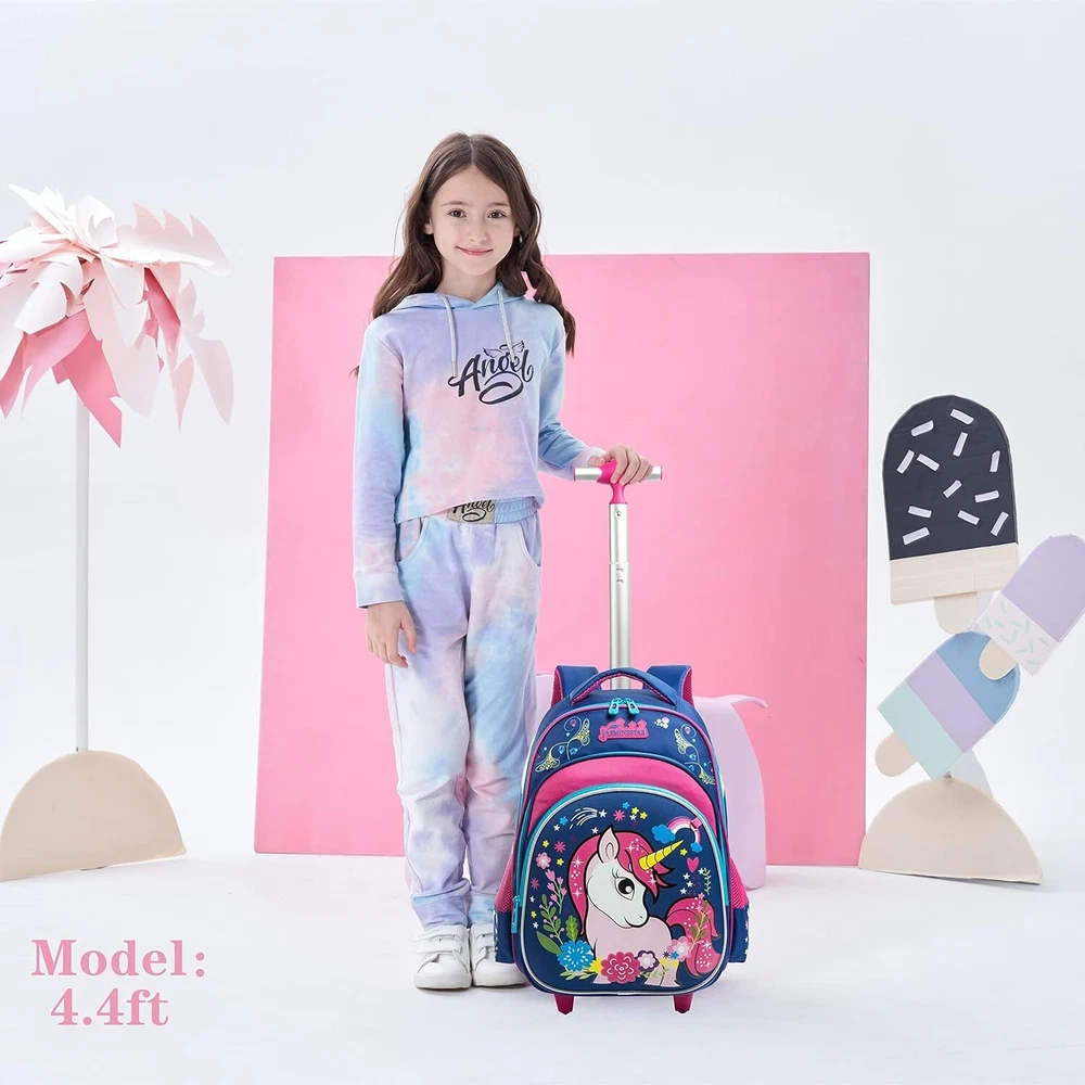 Girls Unicorn Rolling Backpacks Kids Backpack with Wheels for Girls School Bags with Lunch Box 3 in 1 Kids Rolling Backpack """,lunch bag:9""",pencil """,highest height of trolley is ";Multi-function for kids,as a luggage to reduce load,or as a backpack,or a handbag with a handle on the top of backpack. Girls unicorn rolling backpack capacity:1 large main pocket adopt with 1 laptop compartment;2 zipper front pockets for IPAD/A4 size items;2 mesh pockets for water bottles;1 special pencil case which can hung on the backpack;1 lunch bag with adjustable straps which can be as shoulder bag or a handle bag. Unicorn school bags details:Noiseless 4 wheels design with high-strength aluminum alloy rod,front pocket adopt EVA material. Kids backpack quality:Nylon material made,designed breathable back and padded shoulder Straps,they greatly reduced the the pressure in the back and rod and the bag can't be removed ,please note) No matter you are teen girls,boys,go to school,outside sports,or a travel,you can choose one to used in any place you want to carry your laptop,books, for Primary school students 3 in 1 girls unicorn rolling backpack will bring happiness to your kids!Backpack """,lunch bag:9""",pencil """;Highest height of trolley is ";Multi-function for kids,as a luggage to reduce load,or as a backpack,or a handbag with a handle on the top of backpack.