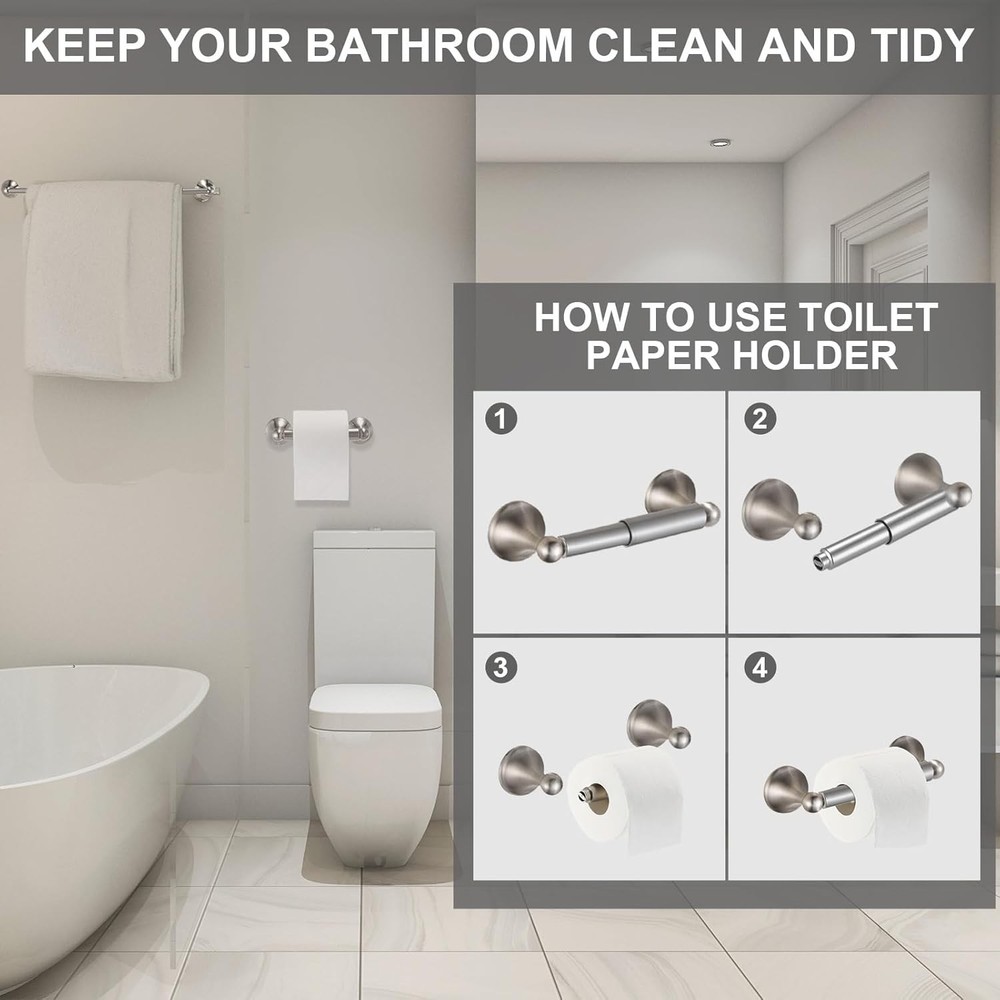 Gisafai 16 Pcs Bathroom Hardware Accessories Set Adjustable Expandable Silver Product Details Color: Silver Material: Zinc alloy, Stainless Steel, ABS roller Product Dimensions: 6.69"L x 6.29"W x 24.21"H Finish Type: Brushed Brand: Gisafai Installation Type: Screw-In Shape: Round, Straight, T-Shape Manufacturer: Gisafai Item Weight: 6.93 pounds Country of Origin: China Item model number: Gisafai-2S-A Multifunctional Complete Set: 16 pcs bathroom hardware kit includes 4 pcs of 24 inch tower bar, 4 pcs of towel ring, 4 pcs of toilet paper holder, 4 pcs of Y shape robe hook, make your bathroom remodel easy; The spring toilet paper holder can easily prevent the tissue roll from spinning and falling; The wall hook and round hand towel ring can be applied to hang various kinds of stuff in different rooms; Towel ring can be rotated at 180 degrees Modern and Safe Design: the intimate design of the two ends closed paper towel rack can avoid the toilet paper fallen; Our towel racks for bathroom is suitable for humid environments such as bathrooms and kitchens; Each piece of this towel holder for bathroom wall has been finely polished ensure the surface is smooth, chamfering edges, and would not stab you or damage your towel, protect your body or clothes from scratching Quality Material: towel bar set constructed of quality stainless steel and zinc alloy; Brushed silver bathroom hardware set has resisted scratches, corrosion, rust and tarnishing for durability and reliability; Keep the surface spotless with maximal maintenance, save energy and time on daily cleaning; Max weight capacities range from 11-22 Lbs Easy to Install: our bathroom towel rack set comes with all mounting hardware pack and detailed installation instructions; This bath set towel bar, towel ring and toilet paper holder are concealed screw mount, wall mount, firmly attached to the wall; You can easily nail it Ideal for use in bedrooms, kitchen, bathrooms, laundry room, patio and spas Smooth Surface: concealed screw design makes the product look beautiful and modern, clean lines and contemporary styling, make your bathroom simple and fresh; Brushed hardware set is brushed finish, build to resist daily scratches, corrosion and tarnishing, nicely matches with your fixtures; Specially designed round edges to protect your body from scratches; Safely hang a bathrobe, pants and shirt, bath towel, swimsuits, coats, shower caddy, or other stuff