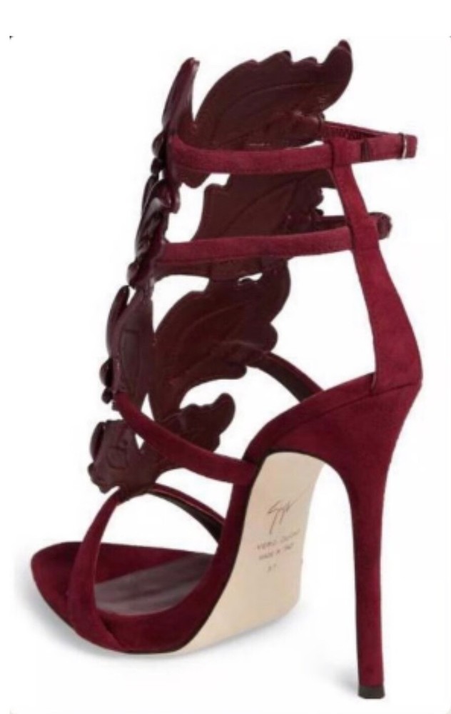 A scene-stealing Italian sandal in an iconic Firewings silhouette and crowned with a dramatic crescendo of polished flames and lifted by a sky-high stiletto heel. Striking a balance between whimsical and edgy, Giuseppe Zanotti's Burgundy cage sandals are armored with sweeping, sculptural wing embellishment for an unforgettable evening look. Heel Style: Stiletto Toe Style: Open Toe 5" heel; 3/4" platform, 4" ankle strap height. Made in Italy. FABRIC / MATERIAL suede upper, leather lining, leather sole FIT TIP Fits true to size.