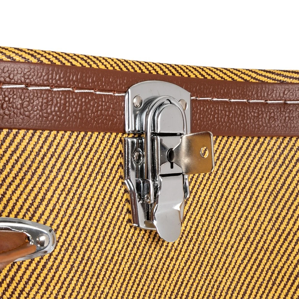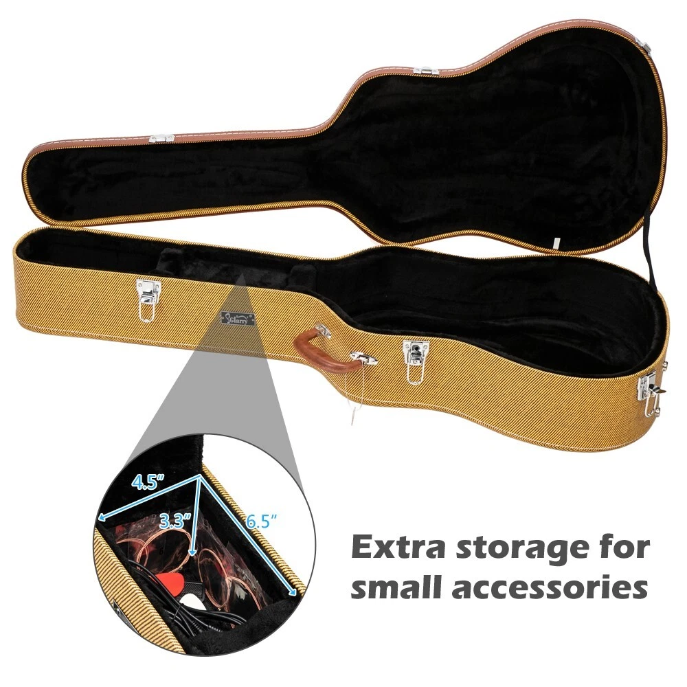 This high-quality case is designed to perfectly fit your Dreadnought Acoustic Guitar. This case is made to specifically fit standard dreadnought acoustic guitars with an overall length of 41". Made with durable wood and faux tweed material, it provides sturdy protection against scratches, dings, and other damages. The case features a wooden hard-shell lockable design, ensuring that your guitar stays safe and secure during transportation. With its vibrant yellow color and stylish design, this case is the perfect addition to your guitar gear. It is manufactured in China and is branded with the Glarry logo. This case is a must-have for any guitar enthusiast who wants to keep their instrument safe and secure during transport. ***Please see detailed dimesnions in 5th photo to make sure this case will work well for your guitars. Features: 1. It is made of high quality wood, leather, plush and hardware accessories material, durable and sturdy 2. Comfortable molded handle 3. Designed for acoustic guitars 4. Deluxe plush interior with foam molded support 5. Fashion and simple design Specifications: 1. Dimensions: (44.5 x 17.7 x 7.3)" / (113 x 45 x 18.5)cm (L x W x H) 2. Color: Yellow 3. Weight: 148.15oz / 4200g 4. Material: Wood & Leather & Plush & Hardware Accessories 5. Leather Pattern: Microgroove 6. Surface Type: Flat 7. Suitable Guiatr Size: 41" 8. Total Length: Inner Diameter: 43.31" / 110cm, Outside Diameter: 44.49" / 113cm 9. Neck Length: Inner Diameter: 20.47" / 52cm, Outside Diameter: 21.26" / 54cm 10. Box Length: Inside Diameter: 22.83" / 58cm, Outside Diameter: 23.23" / 59cm 11. Width of the Lower Part of the Box: Inner Diameter: 16.14" / 41cm,Outside Diameter: 17.72" / 45cm 12. Upper Segment Width: Inner Diameter: 12.01" / 30.5cm, Outside Diameter: 13.78" / 35cm 13. Spindle Box Width: Inside Diameter: 11.22" / 28.5cm, Outside Diameter: 12.60" / 32cm 14. Upper Cover Depth: Inner Diameter: 1.18" / 3cm 15. Bottom Cover Depth: Inner Diameter: 5.12" / 13cm 16. Brand: Glarry