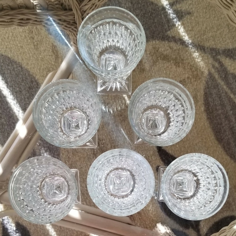 Goblets measure 5.5 inches in height and 2.5 inches in width. The set includes six glasses that weigh a total of 7.5 ounces each, mid-20th century vintage set of six.