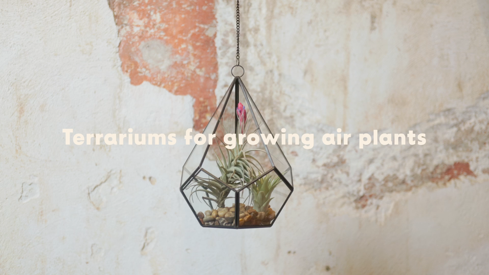 More About Our Glass Diamond Terrariums This multifaceted glass diamond terrarium with black metal accents is sleek and modern. Great for displaying multiple small plants or one medium sized plant. Display your plants alone or add river rocks and moss for added demension. Black link chain included for hanging. This diamond terrarium can also be placed on any flat surface. More About Air Plants Air plants are easy-care house plants in the genus Tillandsia. Air plants are unique because they do not need soil to grow. They are epiphyte plants native to Central and South America. They only need light, water and air to survive. They are great for small spaces, as accents, home decor or party favors. The options are unlimited – Tillandsia can stand alone or pair with an accessory such as a terrarium, ceramic hanger, cork bark, driftwood, and more! Air plants also make great gifts – They are the gift that keeps giving! Air plants reproduce by producing offsets or “pups” from the base of the plant after they show off their spectacular bloom. Every order comes with care instructions. Multiple Uses Air plants add beauty to indoor and outdoor spaces. Place them in terrariums, wall planters, containers, globes and use them to stylize vertical gardens displays. As a succulent alternative, Tillandsia (air plants) can decorate events like weddings, birthdays, for Easter and Christmas. Use them as party favors, Mother's Day gifts, centerpieces or as unique gifts. Easy-To-Care-For Air Plants (Genus: Tillandsia) are hardy bromeliad plants from Central and South America that don't require soil to grow. Simply soak them in water for 20 to 30 minutes once a week and let them dry out. They require indirect but bright light. A care instruction card from Air Plant Shop will be included in every order. Hand Packed & Picked Our shippers are trained to only send the healthiest living plants. We pack every order with quality and care. All our plants come with a 30 Day Guarantee. Let us know if you are not completely happy with your order and we will send you new plants. We have a variety of plants available. Select anywhere from 5 to 5,000 plants we will ship them out the same business day if the order is made by 3 PM Eastern Time Monday-Friday. About Blooming & Color Plants will not always arrive in bloom with red and purple color. However, most will bloom 2-3 times a year. See photos for what the non-blooming green plants look like Air Plant Care Tips Do not plant your air plants in soil. Do not let them stay wet for long periods of time to avoid rotting. Let them dry completely before placing in a glass terrarium. You may cut the unsightly roots off and peel or trim off the brown leaves. Some species have naturally dark bases. Where To Use Air Plants In a terrarium or ceramic holder As a desk plant On a shelf or in a decorative bowl Table centerpieces Party favors On a porch Attach to a tree Pair with driftwood, seashells or cork bark