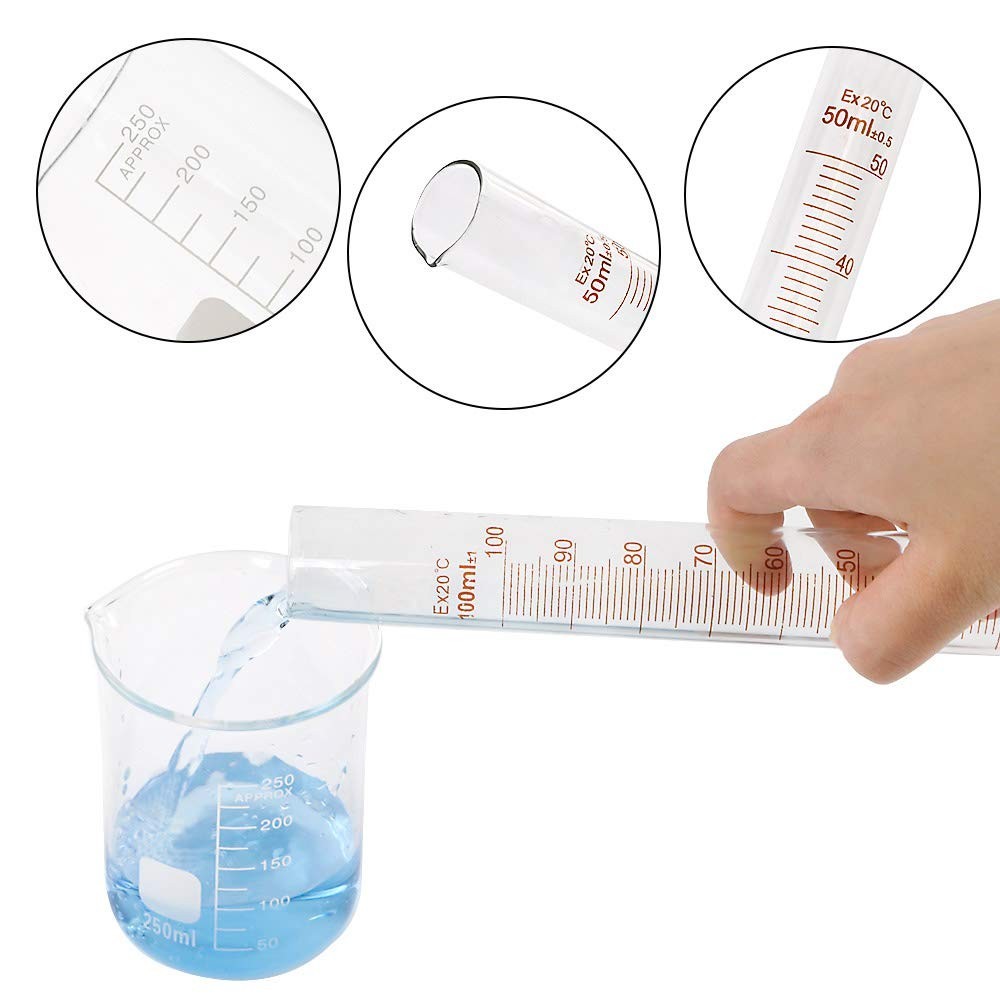 Glass Graduated Cylinder Set 10ml 25ml 50ml 100ml, Thick Glass Beaker Set 50ml 100ml 250ml with 2 Droppers Package contains: glass cylinders in 4 sizes (10/25/50/100ml), glass beakers in 3 sizes (50/100/250ml), and 2 glass droppers. Products: cylinder and beaker are both made of borosilicate glass (GG-17), graduated, laboratory grade glass, acid and alkali resistant, with good stability. Product features: Both the graduated cylinder and the beaker have tapered gates for easy liquid graduated cylinder has stable base, and the scale is clear and easy to read. Packed in thick EPE and carton to prevent damage during transportation. A wide range of sizes, easy to clean. The best gift for experimenters, perfect for school projects, home labs , Halloween theme parties or science-themed birthday parties.