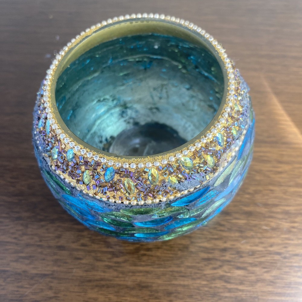 Green, blue and gold glass mosaic candle holder bowl. Dimensions: 4” W x 3” H, top hole opening 2.75” W.