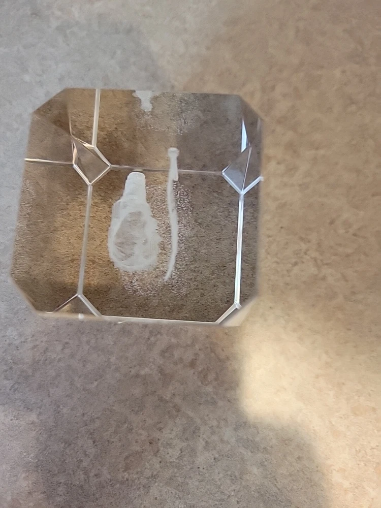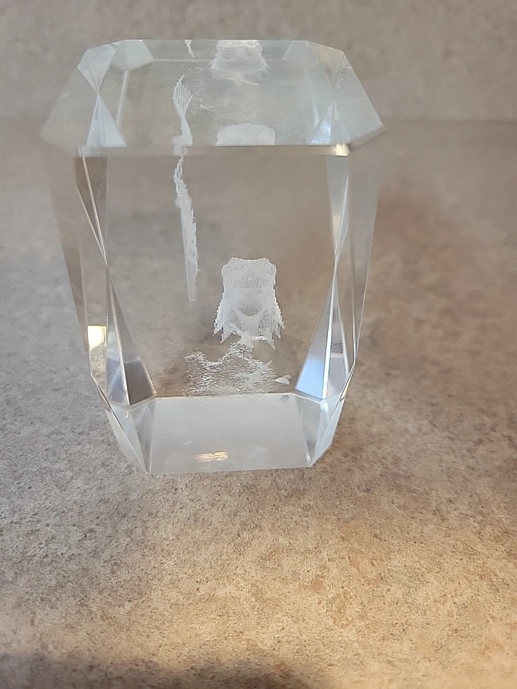 This is a clear glass paperweight with a 3D laser etched eagle and American flag design. It is a patriotic and collectible item that would make a great addition to any desk or display. The unit quantity is one and it is made in China. The brand is Glass and it is not handmade.