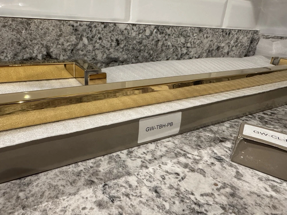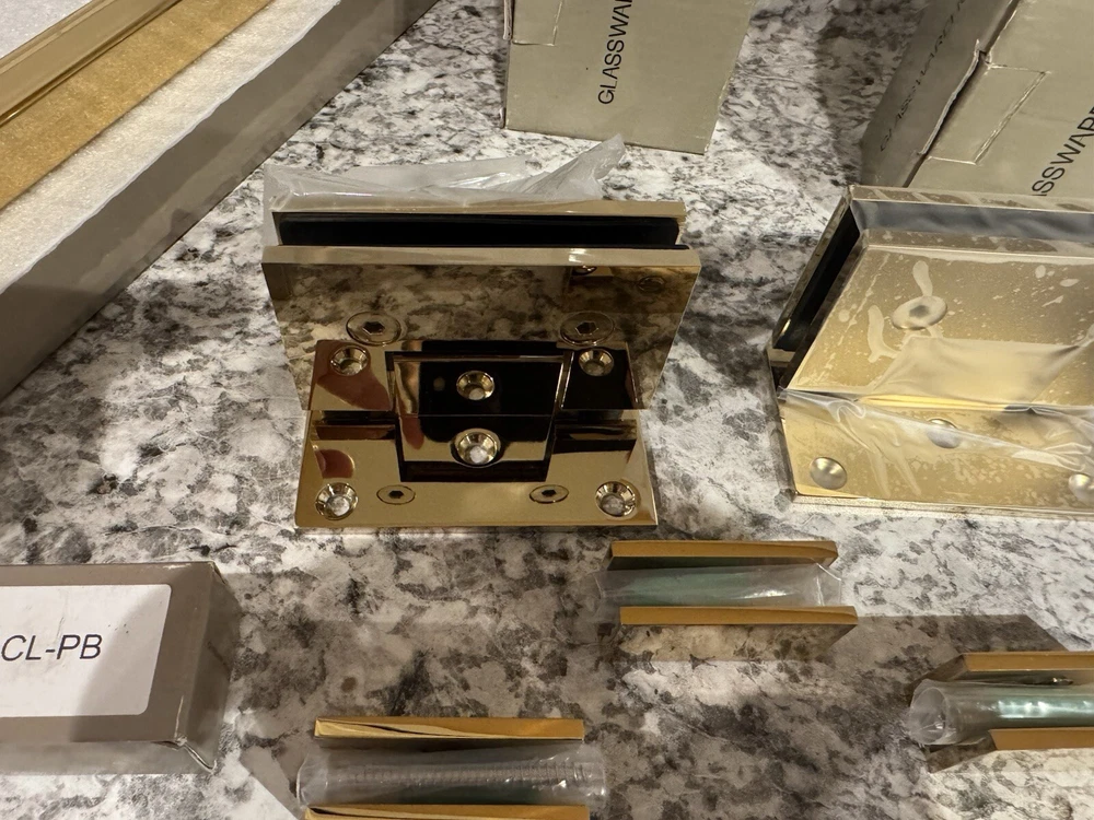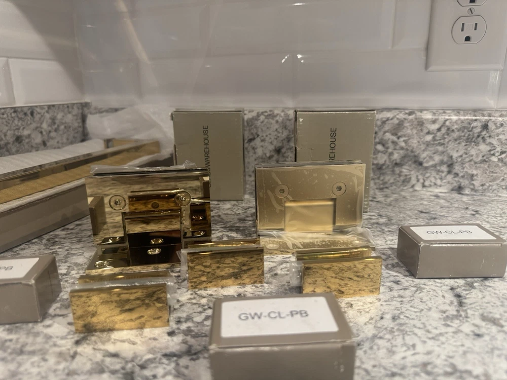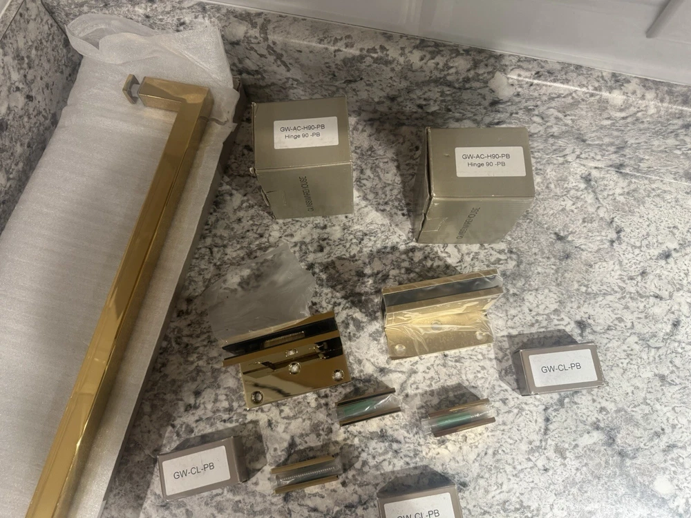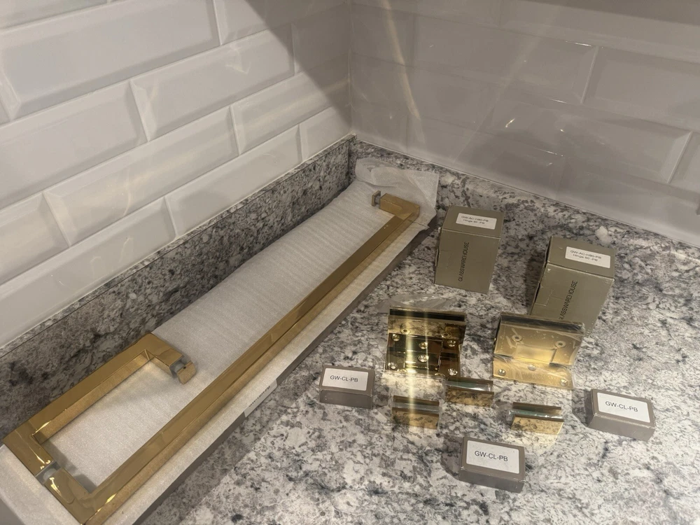Elevate your bathroom's aesthetic with the Glass Warehouse Shower Door Handle Hardware set. This polished brass collection offers a sleek and sturdy solution for your shower door, featuring a hinged opening mechanism for easy access. The set includes six pieces, ensuring you have all the necessary components for a seamless installation. Designed with both style and functionality in mind, these handles boast a bar type design that provides a secure grip. The durable polished brass frame material and finish adapt beautifully to a variety of bathroom decors, making it a versatile choice for your shower enclosure. Experience the perfect combination of elegance and practicality with this top-quality shower door hardware from Glass Warehouse. *Missing one set of three screws for hinge.