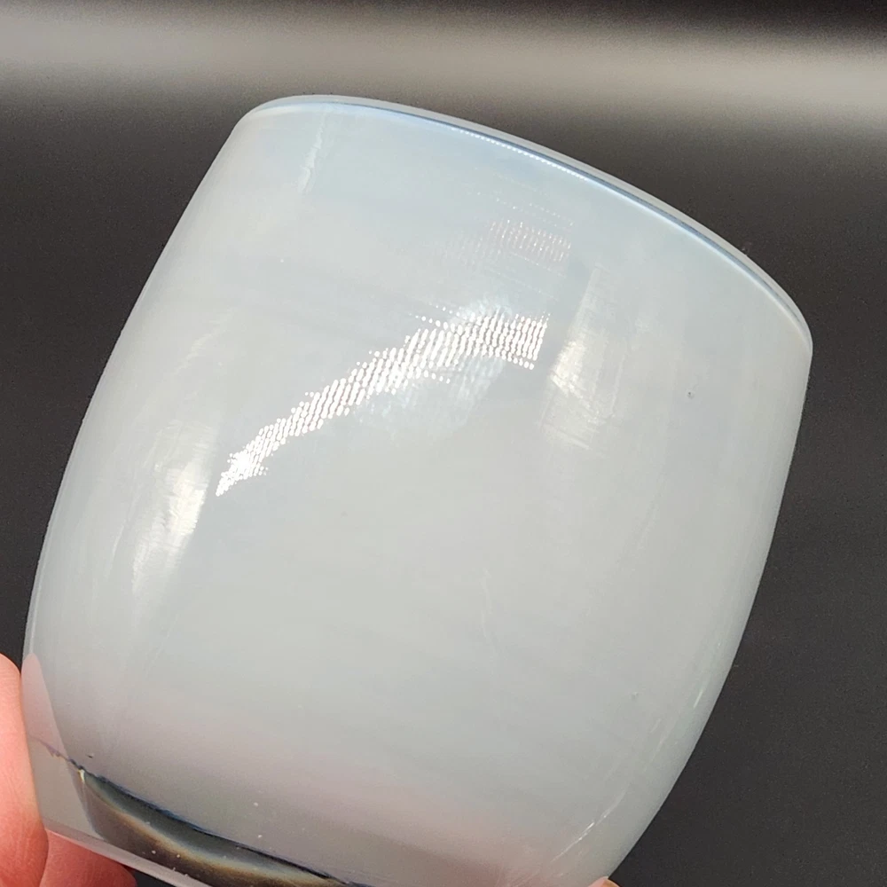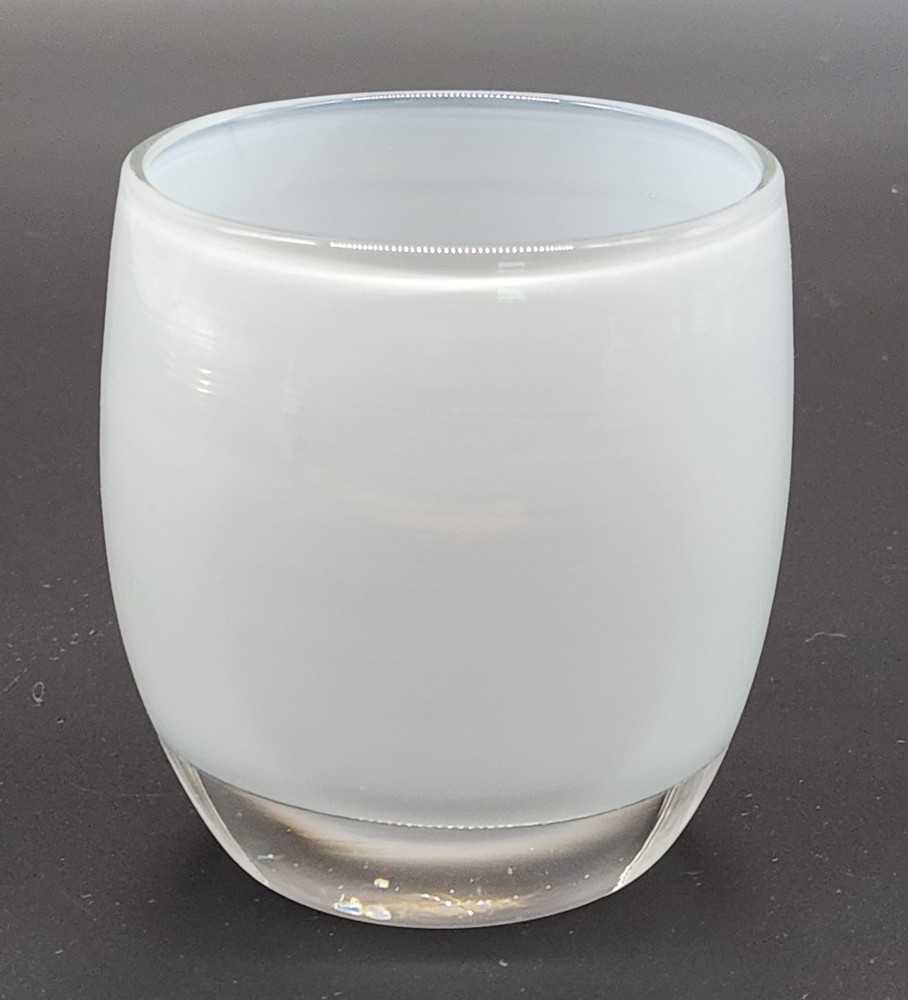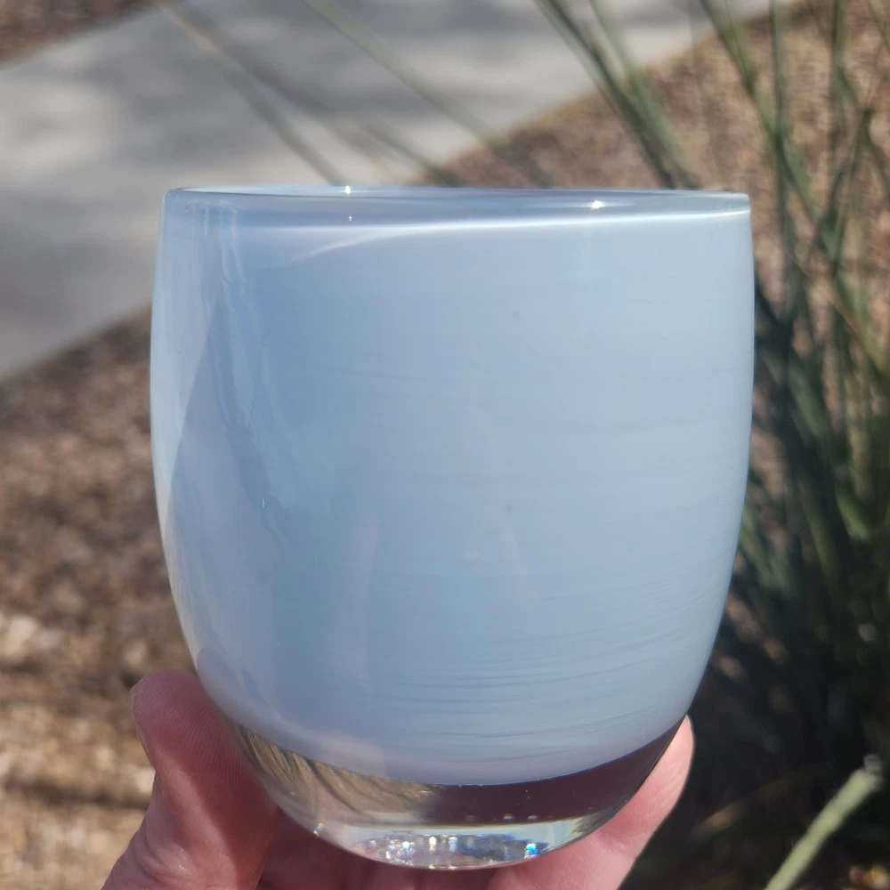 This candle holder radiates kindness, literally. Who knew kindness could be so chic and translucent? Add a glow to your life without spilling your coffee. • Hand-blown glass construction • Light blue color with a clear base • Dimensions approximately 3.5" tall • Made in the USA • Durable and elegant design Used but in very good condition. No marks or wax on the inside. No chips or cracks. See photos for details.