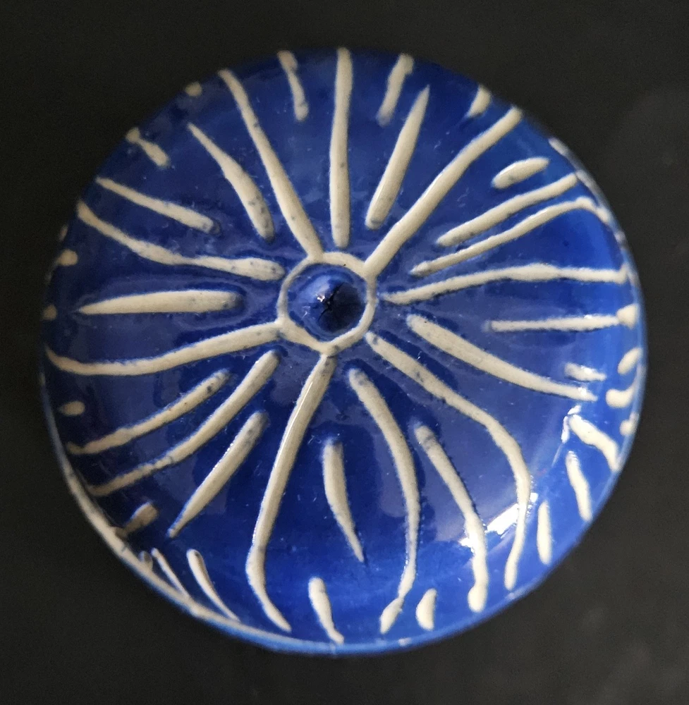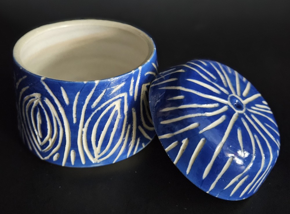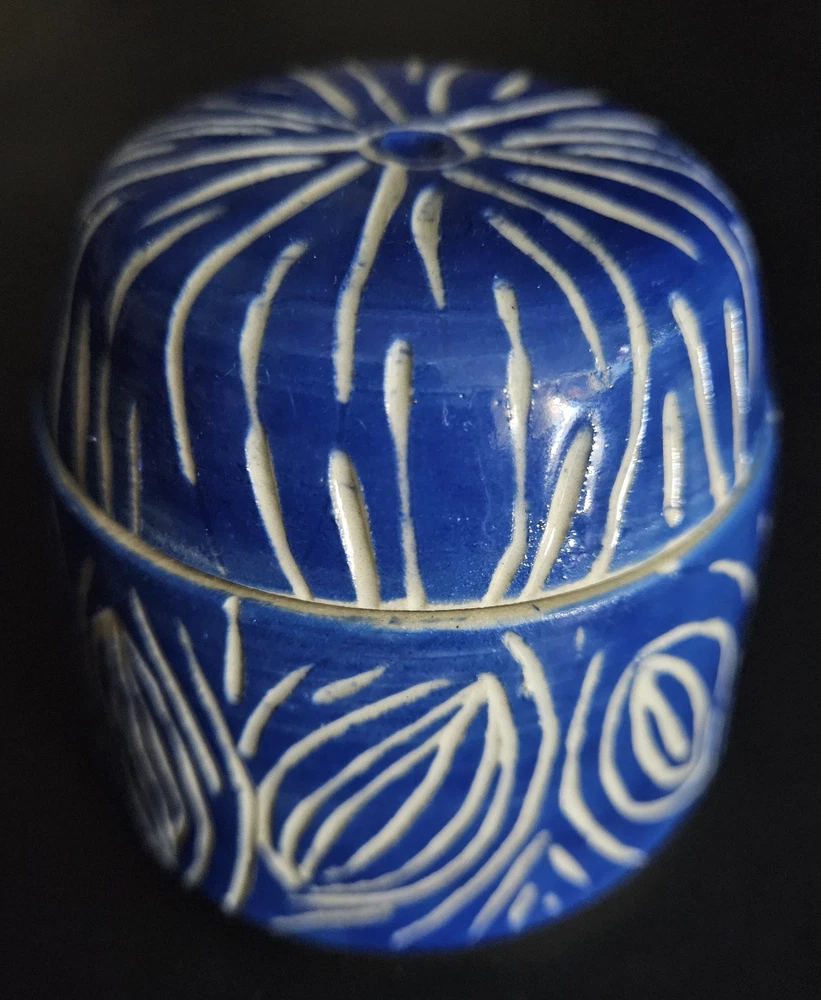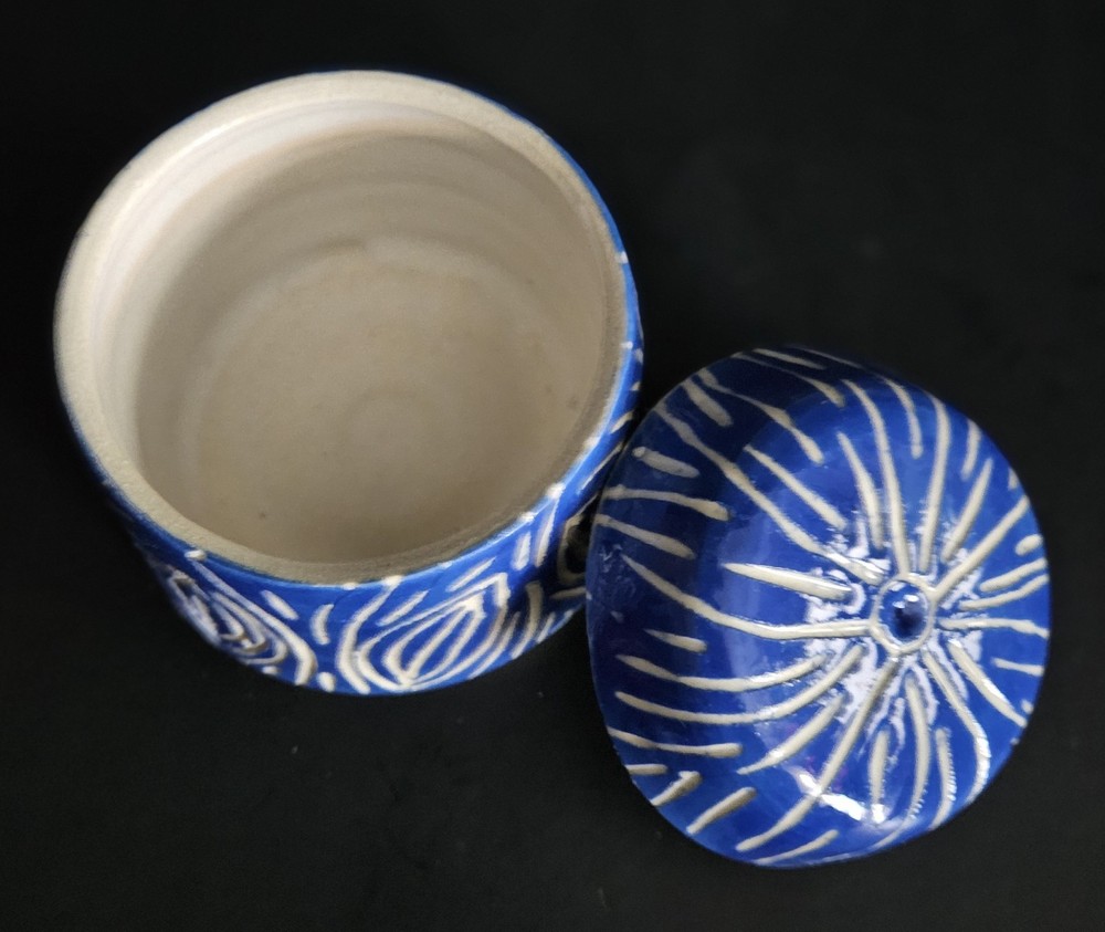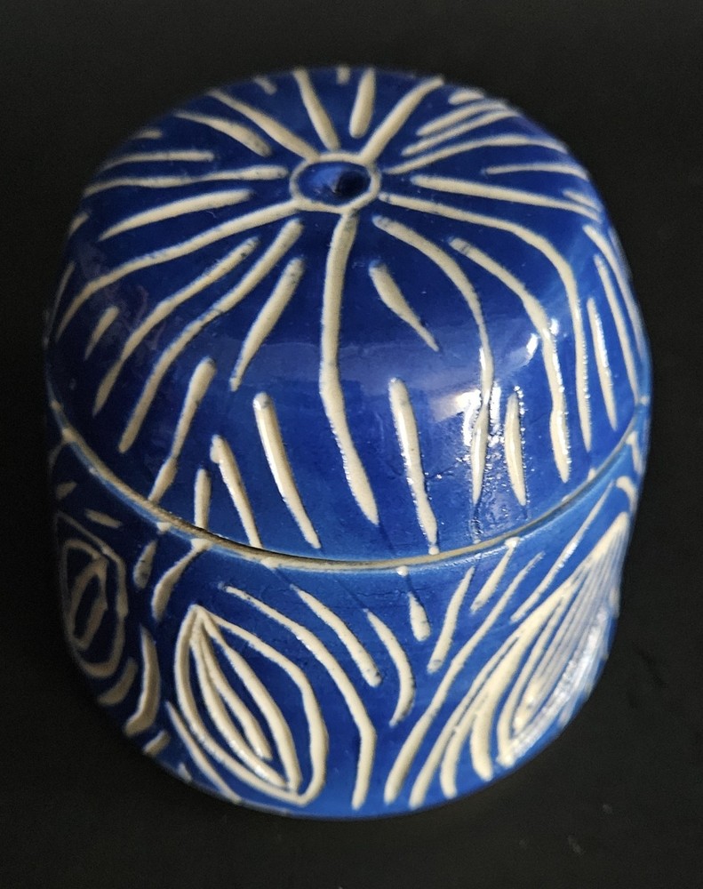 Handmade, hand carved artisan teinket/ keepsake box with lid. 2.5"H x 2.5"W at base. No chips, cracks or damage. Excellent condition. Signed LRT 2009 on bottom.