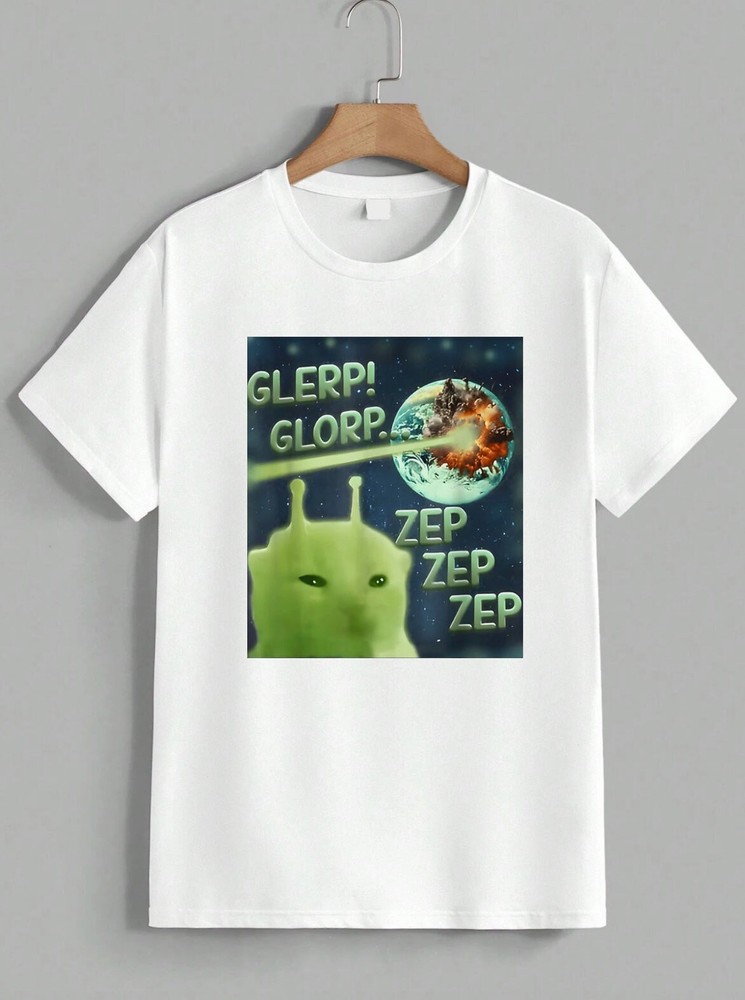 The Glerp Glorp Zep Zep Zep Funny T-Shirt is a unisex green alien cat meme space graphic shirt made of cotton. It features a regular fit, short sleeves, and a round neckline, making it suitable for all seasons. Machine washable and manufactured between 2020-2029, this T-shirt is a fun and unique addition to anyone's wardrobe, perfect for adding a touch of humor to any casual outfit.