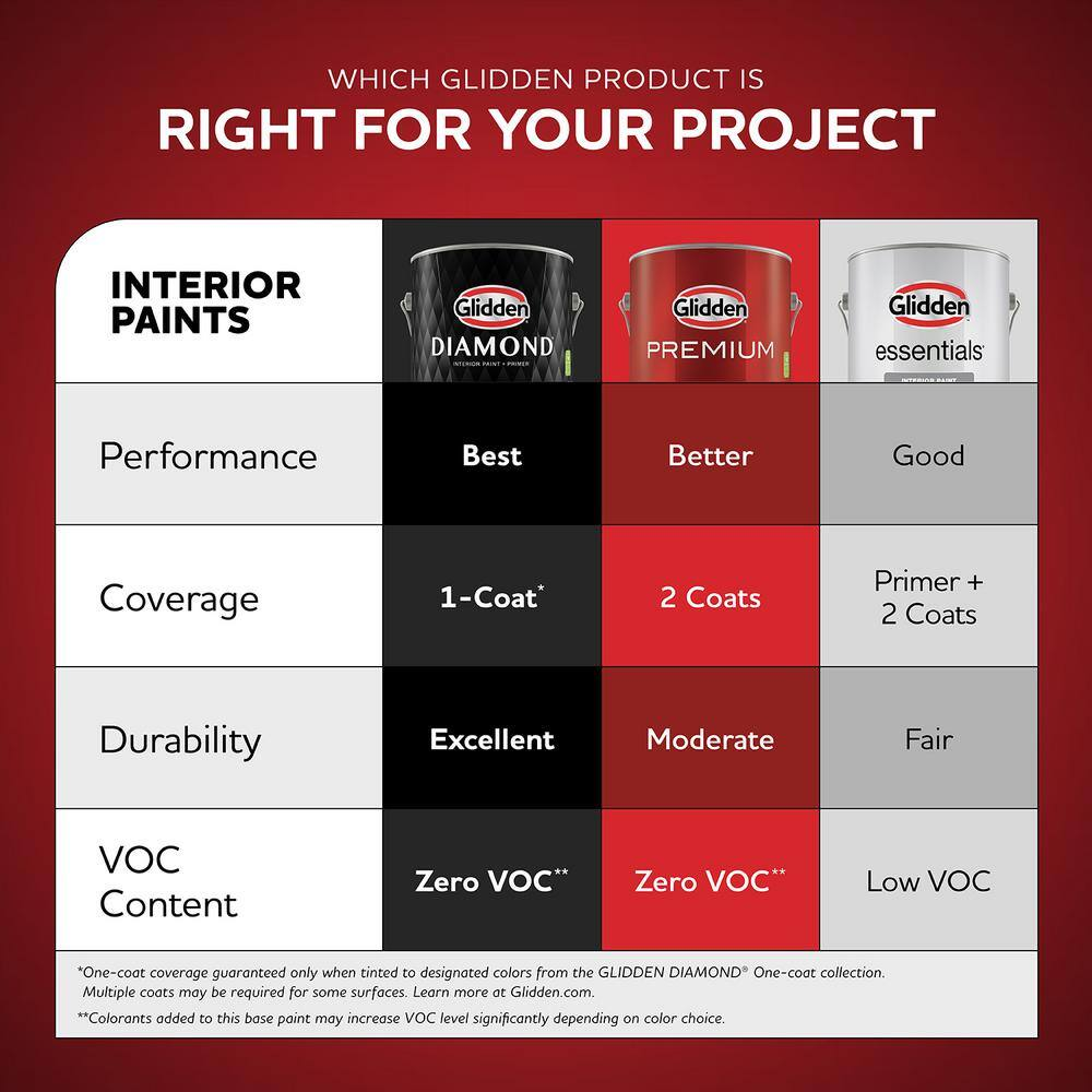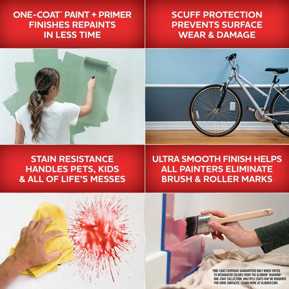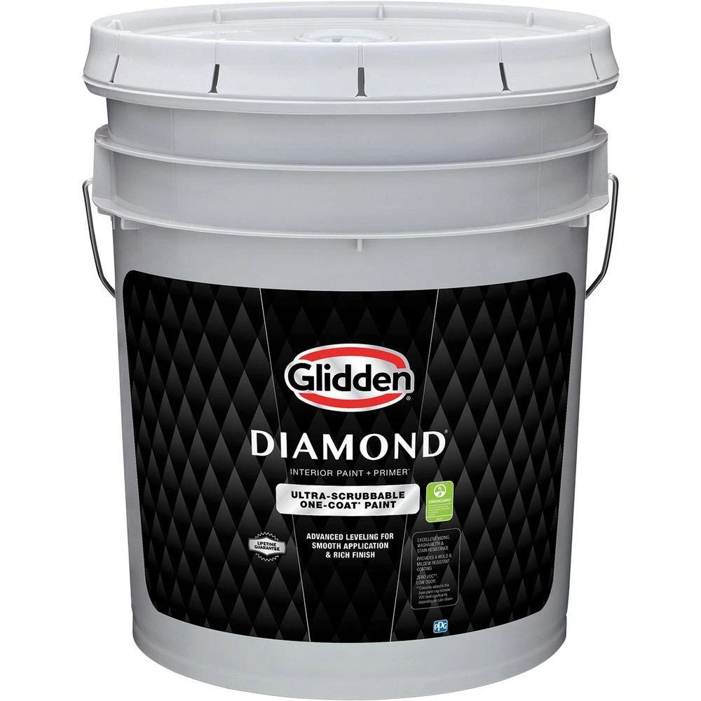 Paint and primer in 1 finishes repaints in less time Ultra scrubbable and smooth paint finish with scuff protection Excellent hiding, washability and stain resistance Glidden Diamond One Coat Interior Paint and Primer delivers exceptional durability that keeps your walls looking great. Its outstanding washability, scrubbability and stain resistance make it a smart solution for any high traffic areas. Glidden Diamond delivers advanced leveling, leading to a smooth application process and painted finish. With Glidden Diamond Interior Paint and Primer you can be confident you'll achieve lasting results.