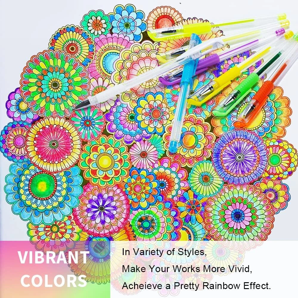 Let your creativity flow with Largest Whole Glitter Set by Aen Art Every moment has the potential to ignite the human spirit and inspire our hearts to create something new and beautiful. For moments like these let your creativity flow with the Aen Art Glitter Gel Pens and capture your ingenious ideas on paper and solidify them from the depths of your imagination. Premium Quality From the Precision 1.0mm Ball Point Tip, Comfortable Grip and replaceable core make our gel pens variety of uses.sketching, doodling, mandala coloring, school projects, scrapbooking, bullet journal, adult coloring books, writing diary, memos, making greeting cards, writing party invitations, writing letters to friends and family, making decoration in all kinds of activities. Long Lasting Enjoy your Aen Art Gel Pens for an insanely long time. The ink in each pen can be used hundreds of times and will still flow smoothly. When the ink does finally run out, the fun could still go on since each pen has a replaceable core. To ensure that your project doesn't come to an unforeseen halt, the pen itself is made from transparent hard plastic, so you can see how much ink is still left in the pen. The etched grooves on the body ensure that the pen doesn't roll away once placed on your work surface. Glitter Pens Only. This is large set of 100 glitter gel pens on Amazon. All 100 colors are unique and we add 30% more ink. It will last longer for adults coloring books, art project and journaling. Smooth and shine. As you know, Those pens are 0.8-1.0mm fine tip which could be used as colored pencil, but it would produce more fine and more vivid lines than pencils Easy to use. Each gel pen is designed with comfort grip, you will never feel tired when coloring for couple hours. Let your fingers relax with those perfect pens High quality ink. With acid-free and non-toxic ink, our sparkly gel pens allow you to enjoy when Coloring Books, School Projects, Party Invites, Greeting Cards, Doodling, Letters to Friends Our gel pens conform to ASTM-D4236. Try to give a set of glitter pens for a gift. For now, drawing pens are popular gifts for girls or artists who like to express imagination