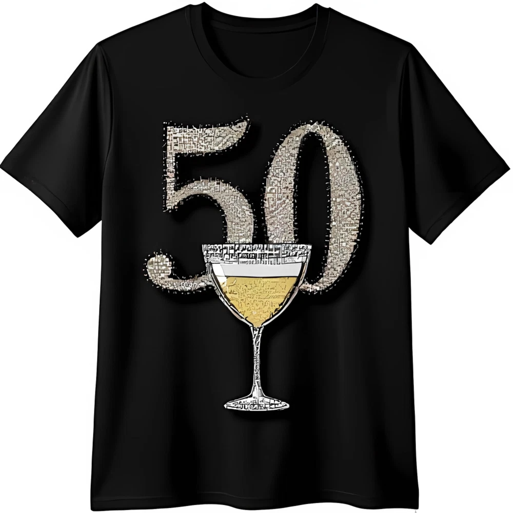 Glittery 50 Black T-Shirt with Gold Rimmed Glass for 50th Birthday Celebration