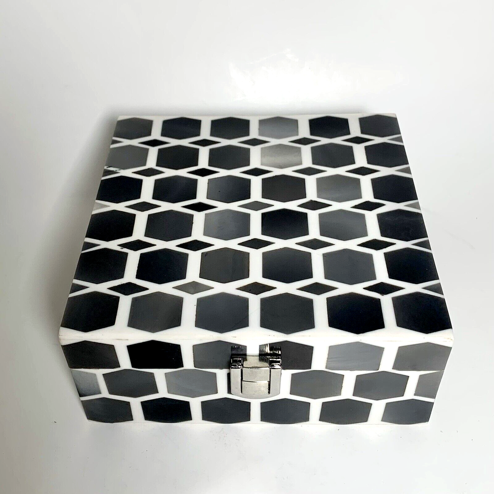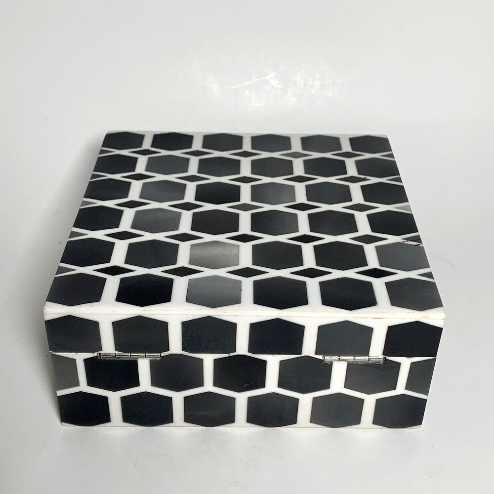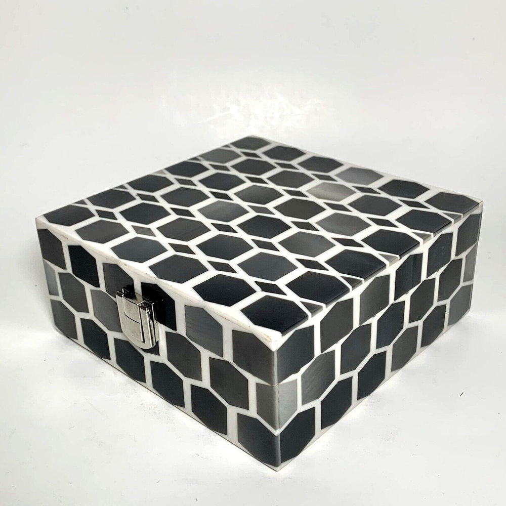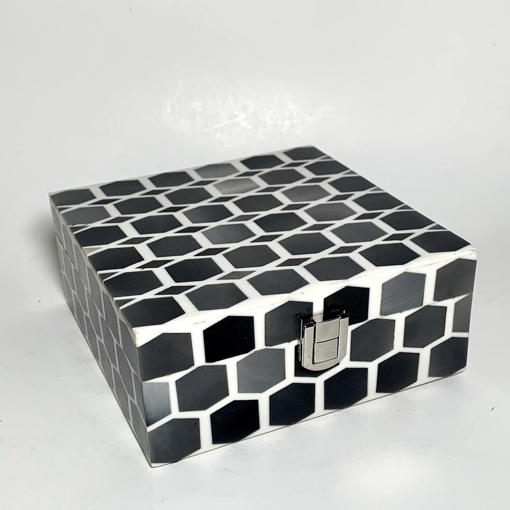 Global Views Storage-Trinket-Keepsake Box Substantial Wooden Inside Inlaid Bone and Resin Black, Grays & Cream Silver toned secure latch and hinges 6" Square A few shallow surface scratches on top. Several tiny chips along edges, on one corner and at base of back right hinge None obviously noticeable. ***I've pointed out a few in close-up photos*** Note: Vintage and pre-owned items will almost always show some signs of usage and wear. I try to describe each item as accurately as possible. ***Please view and enlarge all images for detail and condition verification*** I will gladly combine shipping when feasible. Please contact me for rates if purchasing multiple items. My goal is to provide excellent customer service. If you have any concerns upon receipt, please contact me immediately.