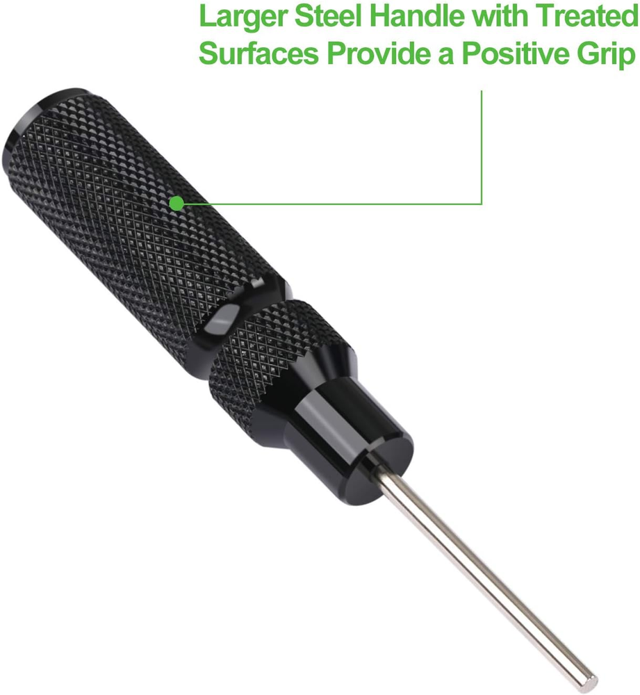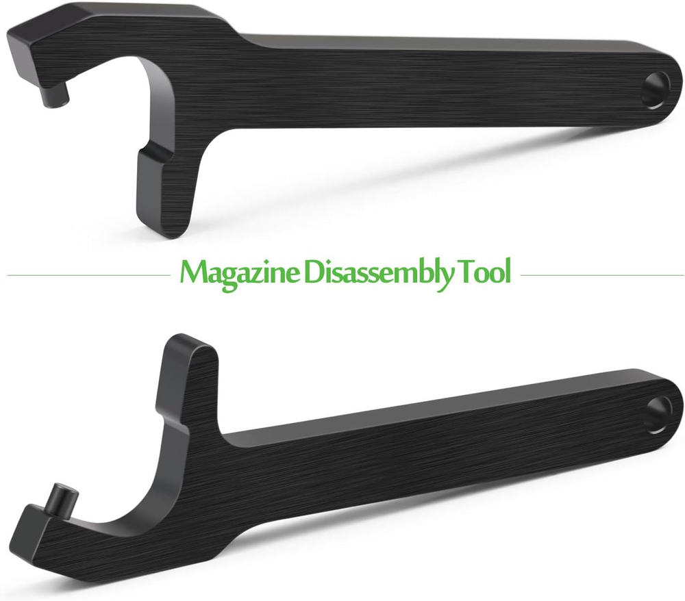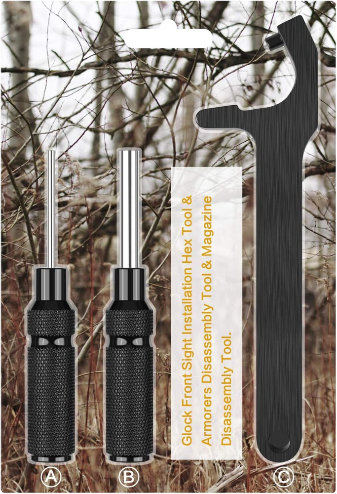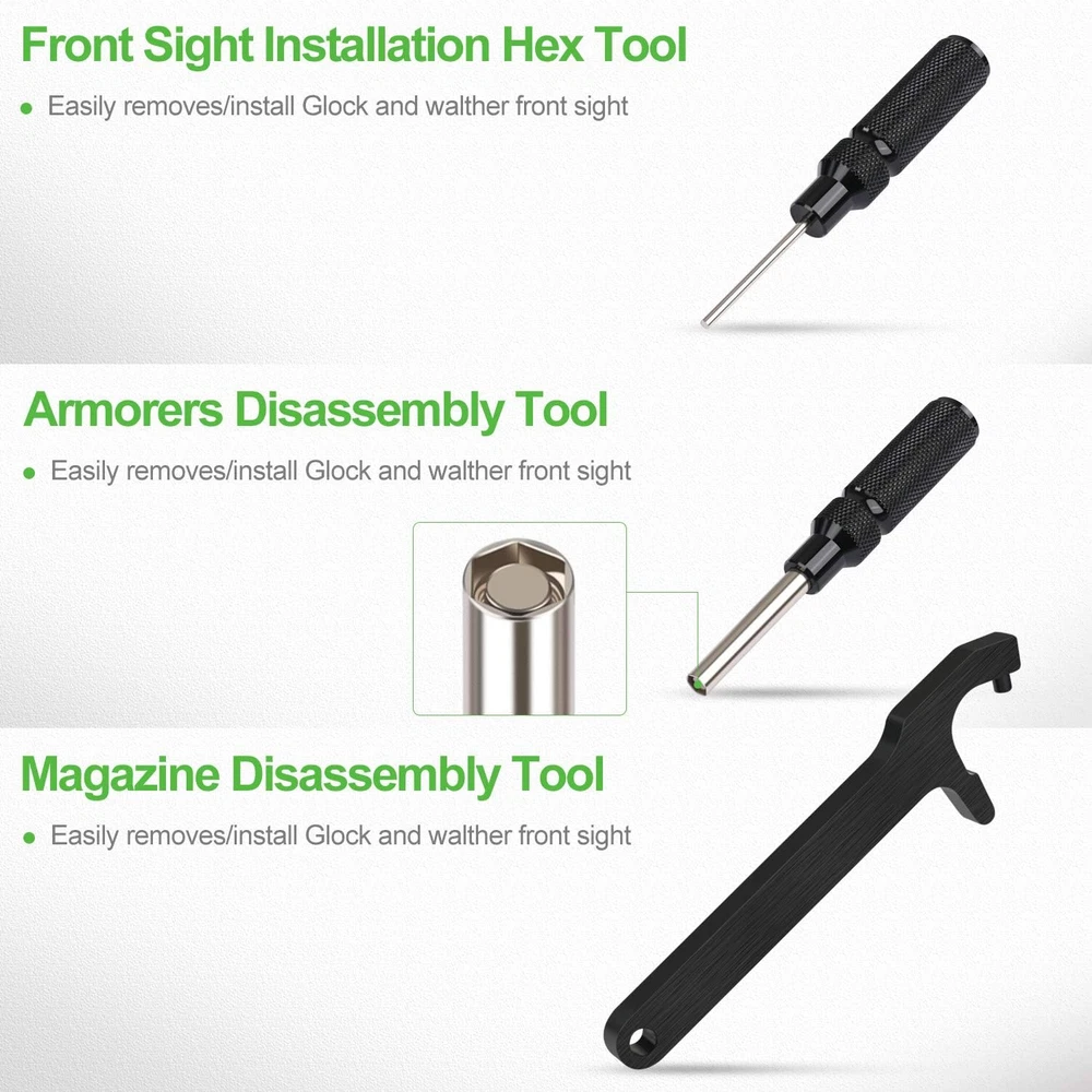 HANDY GLOCK TOOL KIT: 1 Mag Disassembly Tool,1 Pin Punch Disassembly Tool,1 Glock Front Sight 3/16 Hex. Compatible with Most Glock Models HEAVY DUTY MATERIAL And STRONG HANDLE FOR A LONG SERVICE LIFE: All Metal Construction, Made From Machined Aircraft Aluminum with Steel Handle. Larger Steel Handle with Treated Surfaces Provide a Positive Grip, Making it Easier for You to Manipulate MULTIPURPOSE MAG DISASSEMBLY TOOL: Safely and Easily Removes All Flat Bottom Magazine Base Plates for Cleaning and Inspection Without Damaging Your Magazine or Punch. It Can Be Also Used As a Bottle Opener GLOCK FRONT SIGHT REMOVAL And INSTALLATION COMBO Kit: 3/16 Hex Fits for Glock Front Sight Screws, Pin Punch Disassembly Tool for Removing All Pins on Glock EASY TO REMOVE AND INSTALL: An Internal Magnet Tip to Easily Hold the Front Sight Screw Securely in Place. Solid and Perfect for Sight Removal or Installation Product Description XAegis GT08 Magazine Disassembly Tool & Armorers Tool & Front Sight Tool Kit for Glock Armorer's Disassembly Tool Useful for the removal of action/trigger pins during disassembly CNC-machined aluminum body/steel handle Compatible with all Glock models Front Sight Installation Tool Easily removes/installs Glock front sights CNC-machined aluminum body/steel handle Mag Disassembly Tool Removes GLOCK magazine base plates Easily change base plates and replace springs Compatible with GLOCK magazines Made from machined aircraft aluminum Mag Disassembly Instruction Insert post into the circular detent on magazine base plate. Place thumb over opposite end of base plate. Keep magazine pointed in a safe direction. Mag Disassembly Instruction Keeping thumb in place,rock the wrench downwards to pull the base plate away from the magazine. Mag Disassembly Instruction Remove the wrench and use thumb to finish removing the base plate. Mag Disassembly Instruction After base plate has been removed, ease the spring and insert out of the magazine.