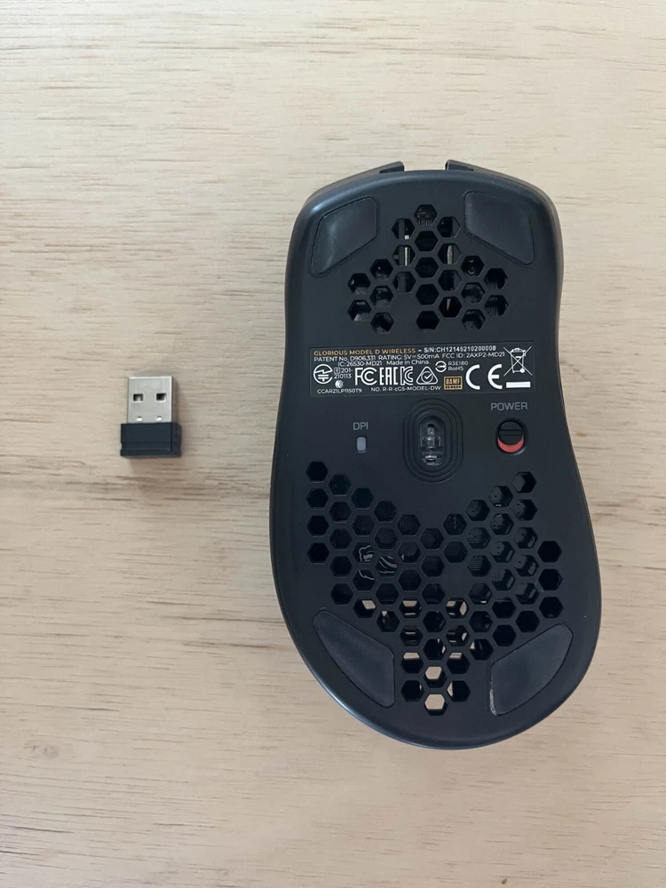 Glorious Model D Wireless Gaming Mouse with Hotline Games PTFE skates, comes with the receiver for the mouse. It's a lightweight ergonomic mouse, great for FPS titles such as Counter Strike. I've had it for about a year, using it daily.