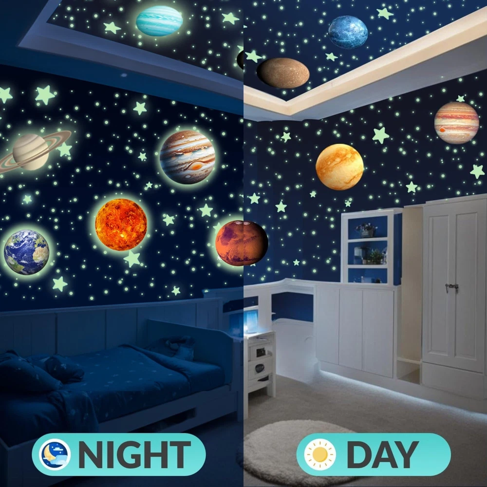 black lights for glow party large space ceiling decor room decor space stickers star lights for ceiling wall stickers big star ceiling decor for bedroom ceiling decorations ceiling hanging decor ceiling stars ceiling stars glow in the dark ceiling wallpaper fantastic planet galaxy decor galaxy room decor galaxy stickers galaxy wallpaper gifts for who love space glow baby glow decorations glow in dark glow in dark stars glow in dark stars for ceiling glow in the dark ceiling stars glow in the dark decor glow in the dark decorations glow in the dark lights glow in the dark paper glow in the dark planets glow in the dark planets for ceiling glow in the dark room decor glow in the dark star stickers glow in the dark stars stickers glow in the dark stickers for ceiling glow in the dark stickers for glow in the dark toys glow in the dark wall decals glow in the dark wall stickers glow stars room glow toys glowing stars for room ceiling green planet kid room decor bedroom decor room room wallpaper wall decals wall decor wall stickers light up wall decor little big planet moon and stars decor moon and stars nursery decor moon decor moon stickers moon wall decor outer space outer space room decor outer space toys planet decorations planet stickers planet toys planet toys for 3-5 planets decor planets for planets for solar system toys 3-5 planets toys for 5-8 science projects for ages 4-8 sistema solar solar system for solar system kit solar system poster solar system puzzle solar system toys solar system toys for 3-5 solar system toys for 5-7 space decor space decor for boys room space gifts space gifts for 8-12 space nursery decor space room decor space room decor for boys space stickers for space stuff space themed bedroom decor space toy space toys for 3-5 space toys for 5-7 space toys for 8-10 space wall decal space wall decor space wallpaper [ Package Includes ] Transform your ’s room with 534 mesmerizing glow-in-the-dark stars for the ceiling. This celestial set includes 525 glowing stars and dots, a radiant Sun, and 8 vibrant planets. Bedtime becomes an enchanting journey through the solar system! Plus, enjoy an included Constellation E-book. [Will Love Bedtime] Transport your to space with our Solar System Glow in the Dark Stickers! Watch as planets and stars illuminate their ceiling, creating a mesmerizing bedtime experience. [Spend Less on Electricity] Transform your ’s room into a celestial sanctuary with our glow-in-the-dark stars and planets. They just require at least 10 minutes of light each day energizes them to radiate a soft, soothing glow all night, guiding your little astronaut to a serene slumber under a galaxy of their own. No more need for nightlights—just a sky full of twinkling constellations, right in their bedroom. [Won't Damage Walls] Create a cosmic wonderland in your ’s room with our premium glow-in-the-dark star stickers. These self-adhesive decals are easy to apply—no putty or tape needed! Just peel them off the sheet and stick them firmly to a flat ceiling or wall. Worried about wall damage? Don’t be! Our stickers adhere securely yet peel off easily, keeping your walls pristine. Transform your ’s space into a mesmerizing galaxy with these stunning stars! [Perfect Gift] Ignite your 's curiosity about space with our celestial decor. These glow in the dark ceiling stickers are ideal for creating a captivating solar system model, making them the ultimate gift for any young stargazer or space enthusiast.