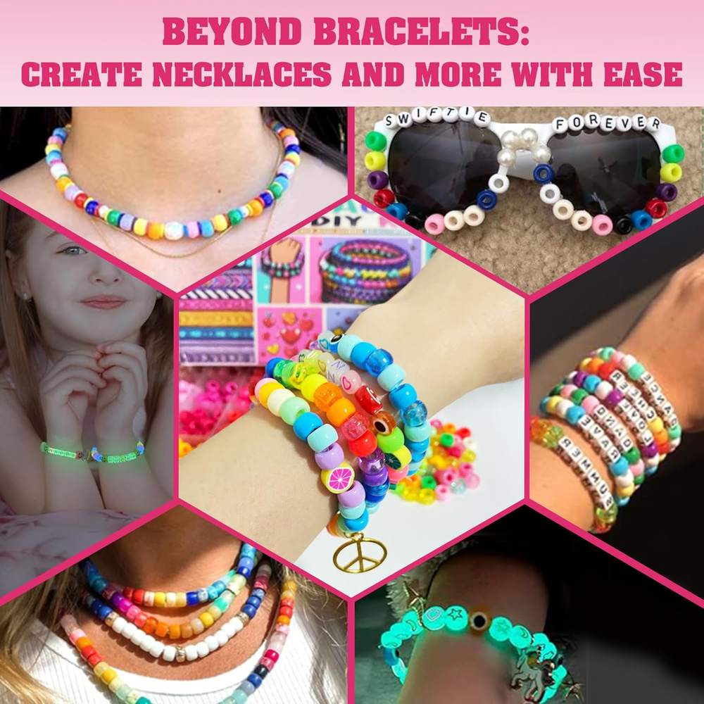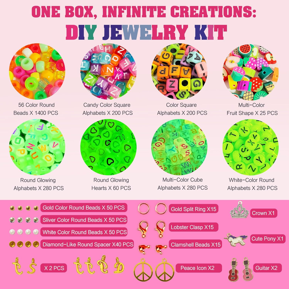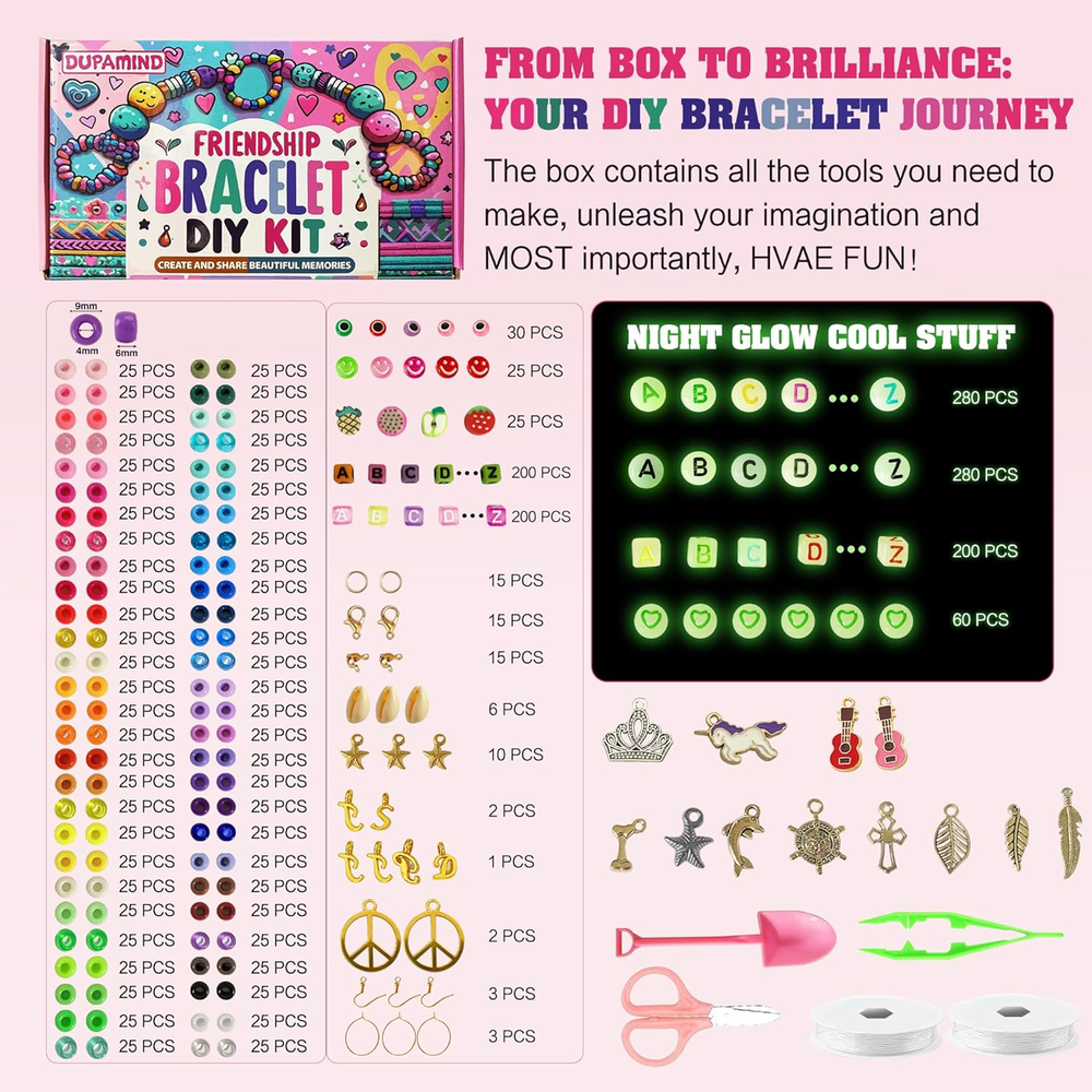 Comprehensive Bead Collection for Endless Creativity: Explore your creativity with a diverse assortment of beads in this Dupamind DIY kit. Featuring 1800 pieces of 9mm colorful pony beads, 600 pieces of glow-in-the-dark beads, and 400 pieces of specialty beads including letter beads, fruit beads, eye beads, smiley face beads, pendants, lobster clasps, and more—every component shown in the image is included. This extensive variety allows for limitless design possibilities. Glow-in-the-Dark Magic: Illuminate your creations with the unique glow-in-the-dark beads included in this Dupamind set. Perfect for adding a mystical touch to your jewelry, these beads emit a soft, captivating glow in dark environments, making your handmade pieces stand out no matter the setting. Durable, High-Quality Materials: Craft with confidence knowing your jewelry is made to last. Our pony beads, glow-in-the-dark beads and accessories are crafted from top-notch materials, ensuring your DIY creations are comfortable to wear, resistant to fading, and waterproof. Whether you're at the beach, by the pool, or in the shower, your jewelry will remain as vibrant as ever. All-Inclusive Crafting Tools: This Dupamind kit includes everything you need to start crafting right away. With easy-to-use tools and a wide array of colorful and stylish components, you can effortlessly design and create unique bracelets and necklaces that reflect your personal style. A Perfect Gift for Creative Fun: This Dupamind DIY bracelet kit is an excellent way to engage with children and encourage creativity. It’s ideal for family activities, providing a screen-free, hands-on experience that fosters imagination. Whether as a birthday gift, party favor, or friendship bracelet, this kit is a delightful present for kids, family, friends, or yourself. Product Description